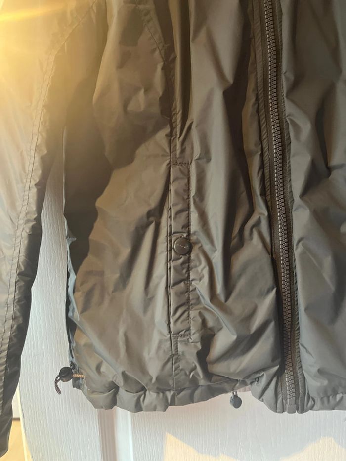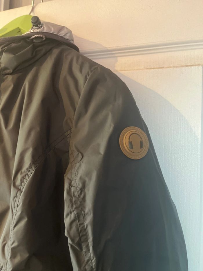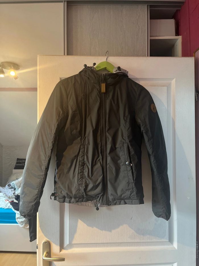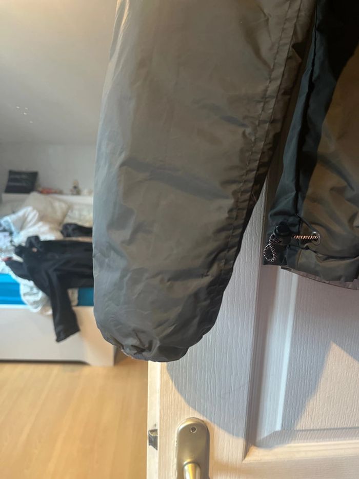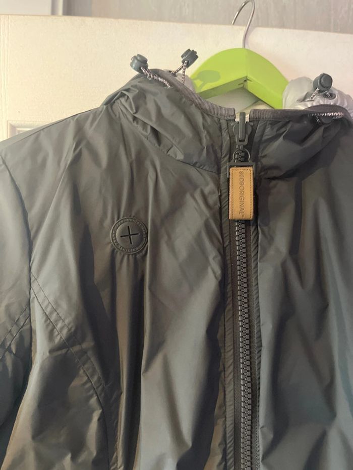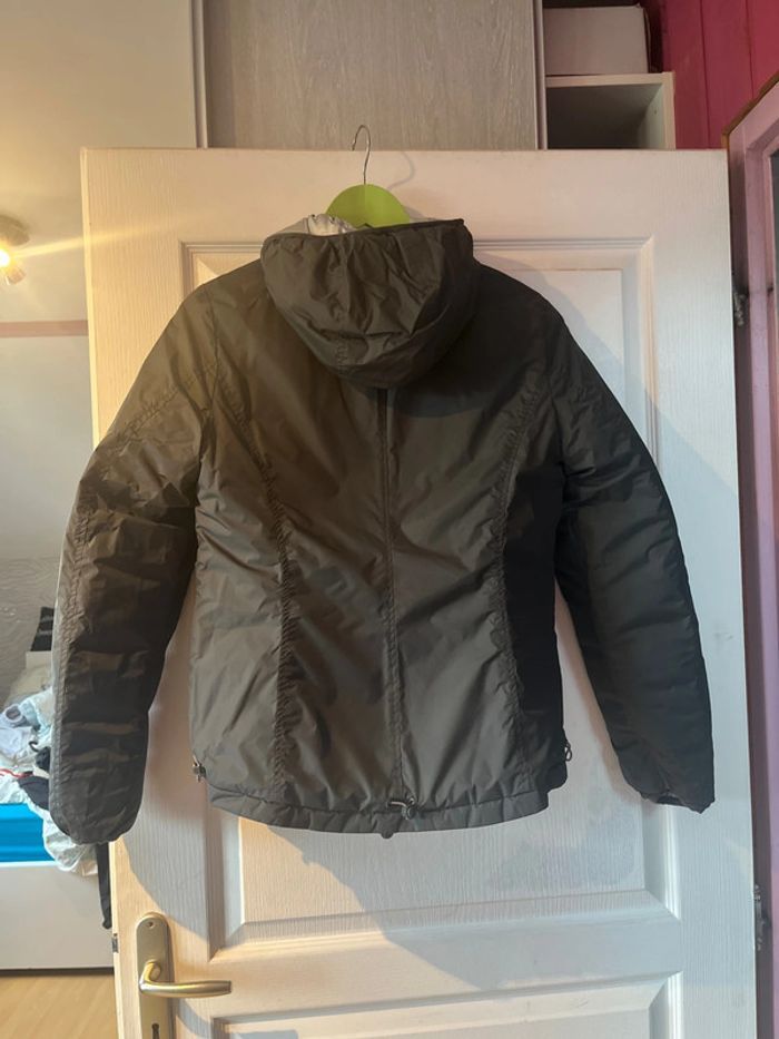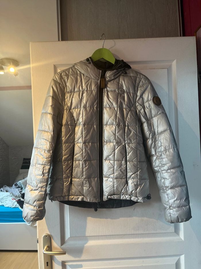 Veste argentée réversible en gris foncé en très bon état. Taille M Avec un bouton cassé (voir photo)