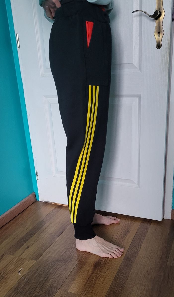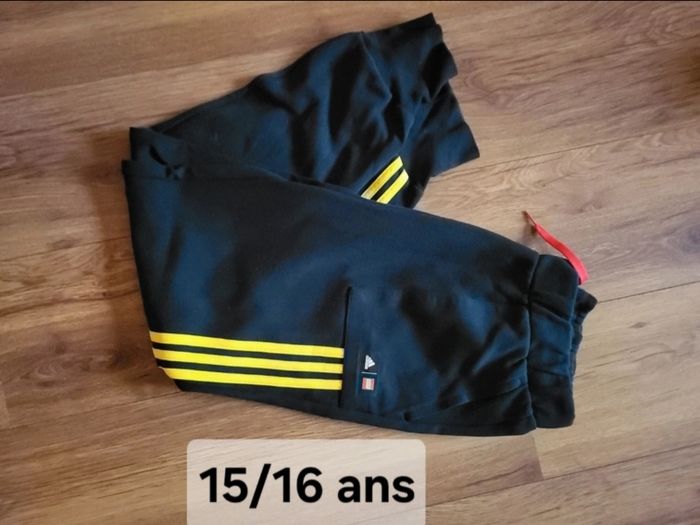 Bas de jogging adidas Matière molleton Taille 15/16ans ⚠️ Defaut : De legeres bouloches sur une poches et de petites traces noires sur les bandes jaunes mais rien de mechant voir photos sinon le jogging est en parfait etat est super sympa de ce fait je met bon etat Ce jogging est également disponible en 9/10ans dans mon dressing