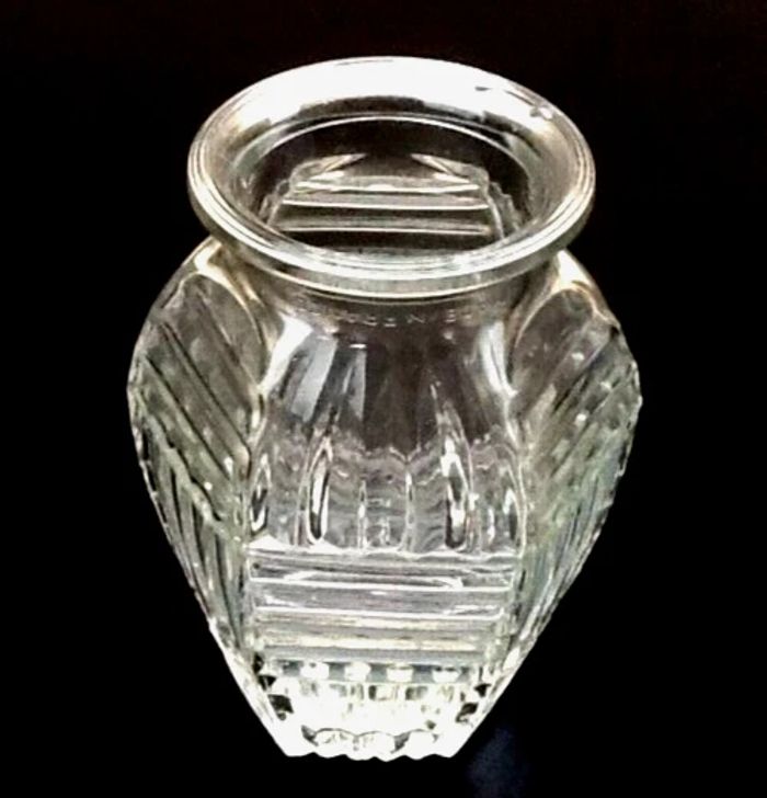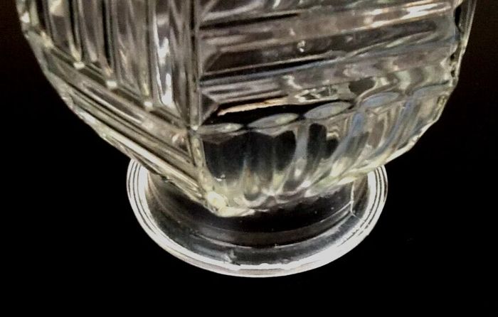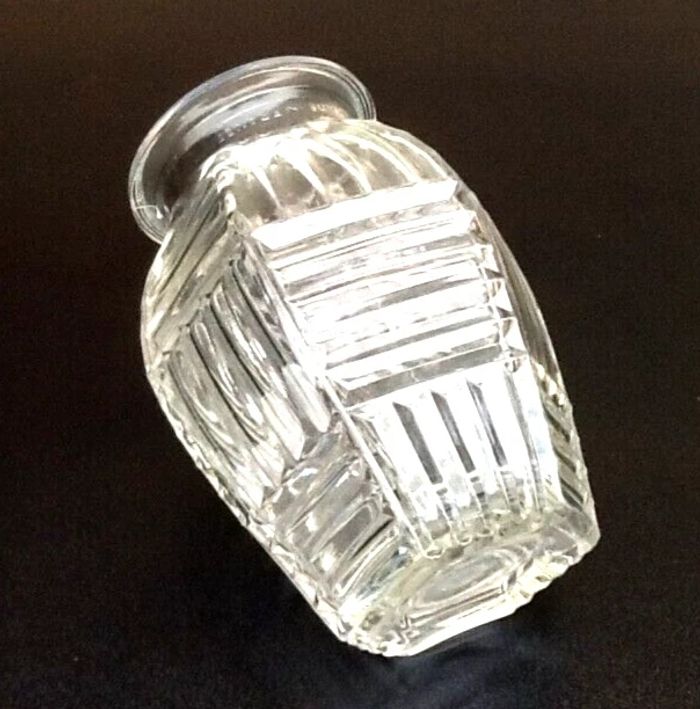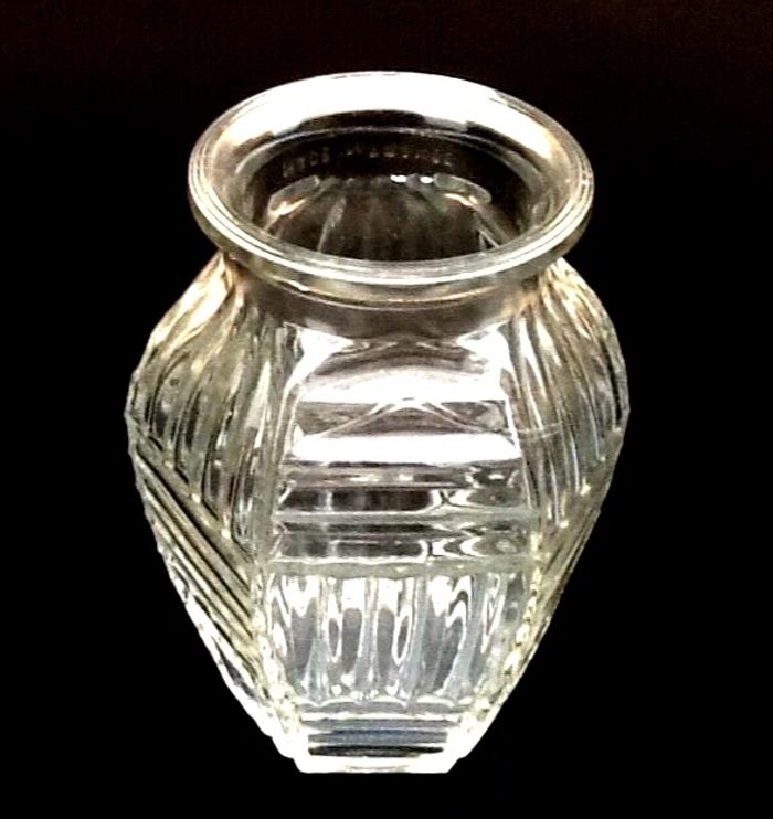 (article vendu en l' état, nous précisons 2 égrénures sous le col photo 2, état d' usage voir toutes les photos). Vase hexagonal de style Art Déco Gravé au col Made in France Verre moulé transparent Décor géométrique (suite de traits horizontaux et verticaux) Hauteur : 130mm Poids : 295grs
