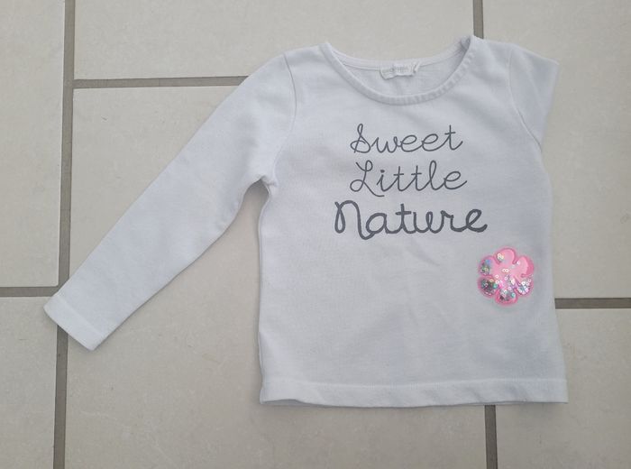 Pull de vouloir blanc avec inscription et motif fleur, de la marque Orchestra, taille 3 ans (98 cm), en très bon état. Article lavé pour la vente.