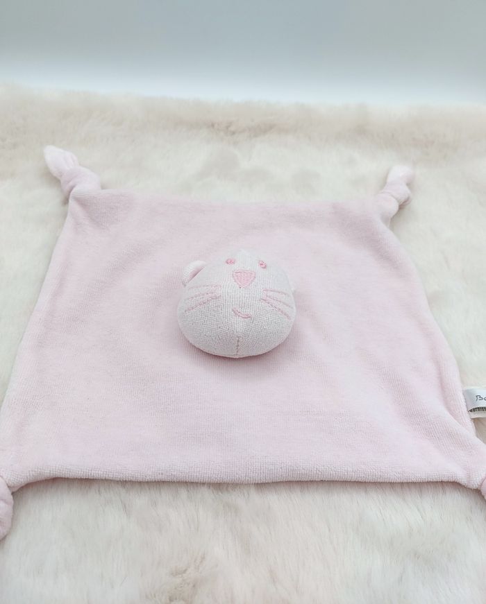 Doudou plat chat rose Boutchou Bout'chou MONOPRIX envers tissu rose 4 nouettes - photo numéro 1