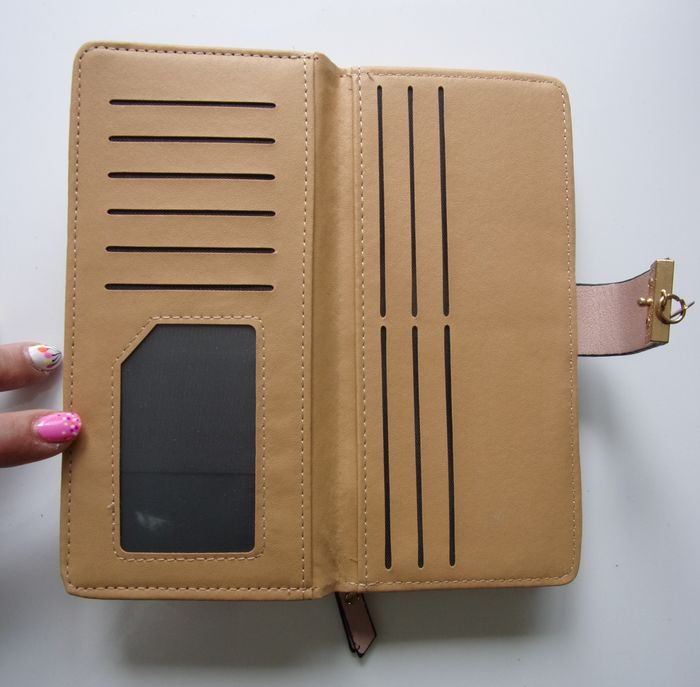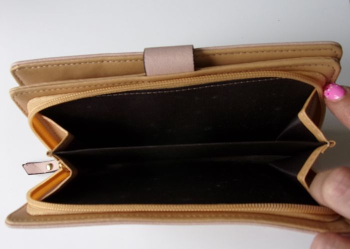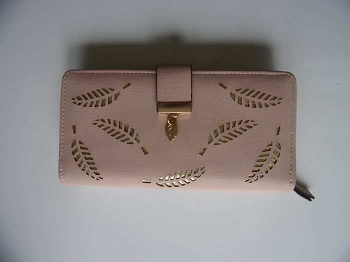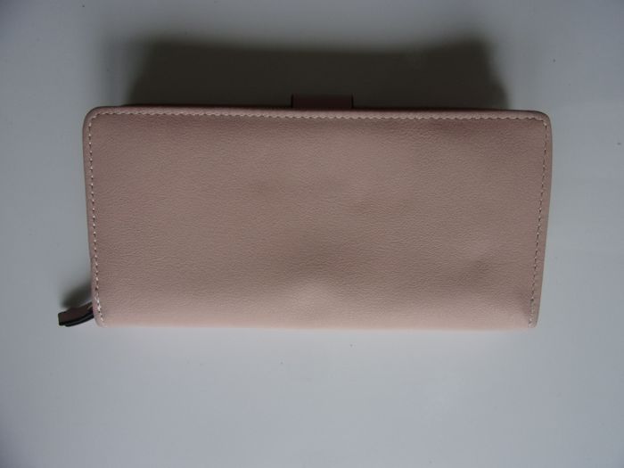 Portefeuille rose pâle et doré (hauteur: 10cm, largeur: 19cm, profondeur: 3cm). Double compartiment et de nombreux rangements pour les cartes Fermeture pression