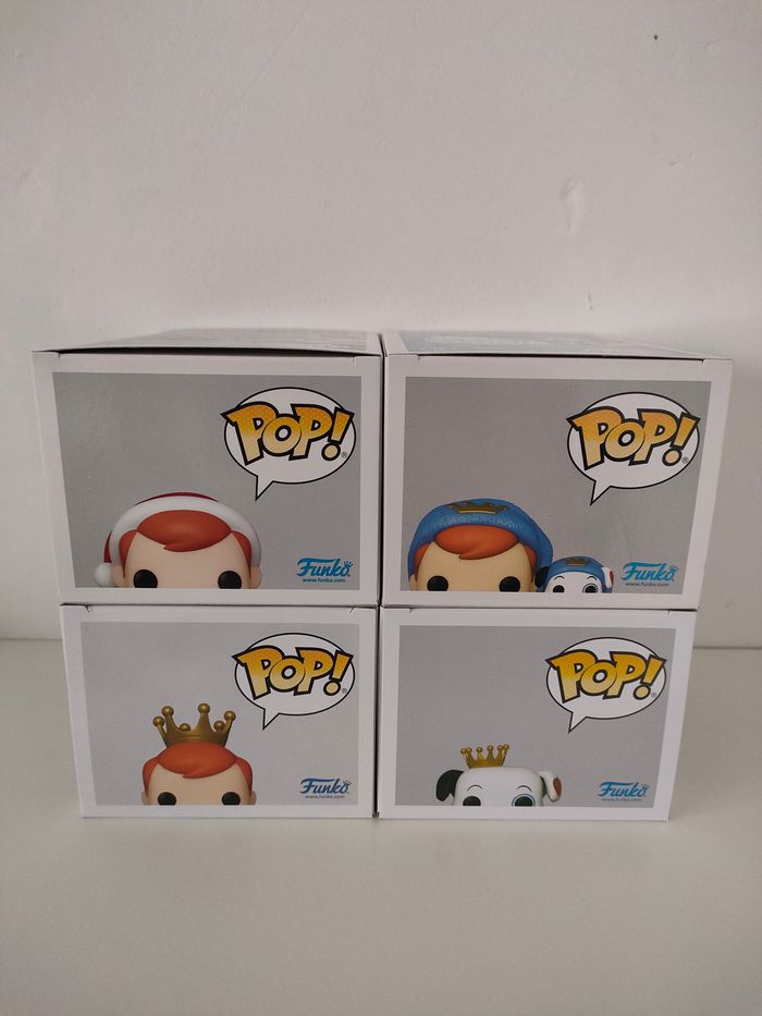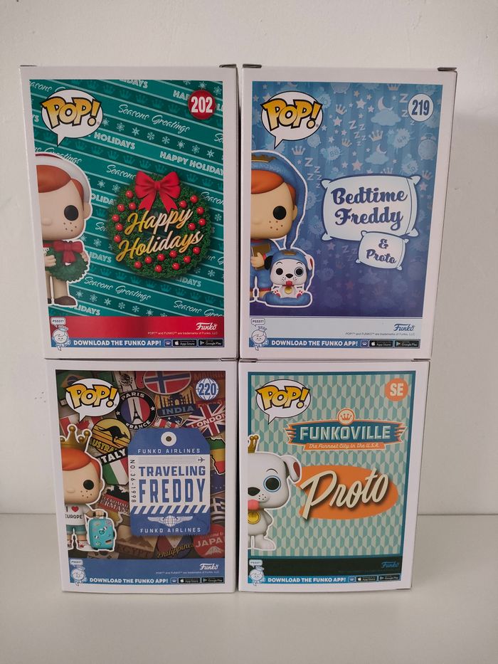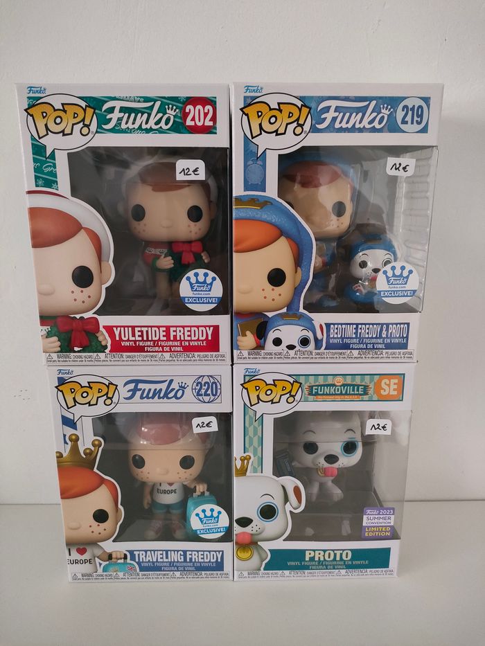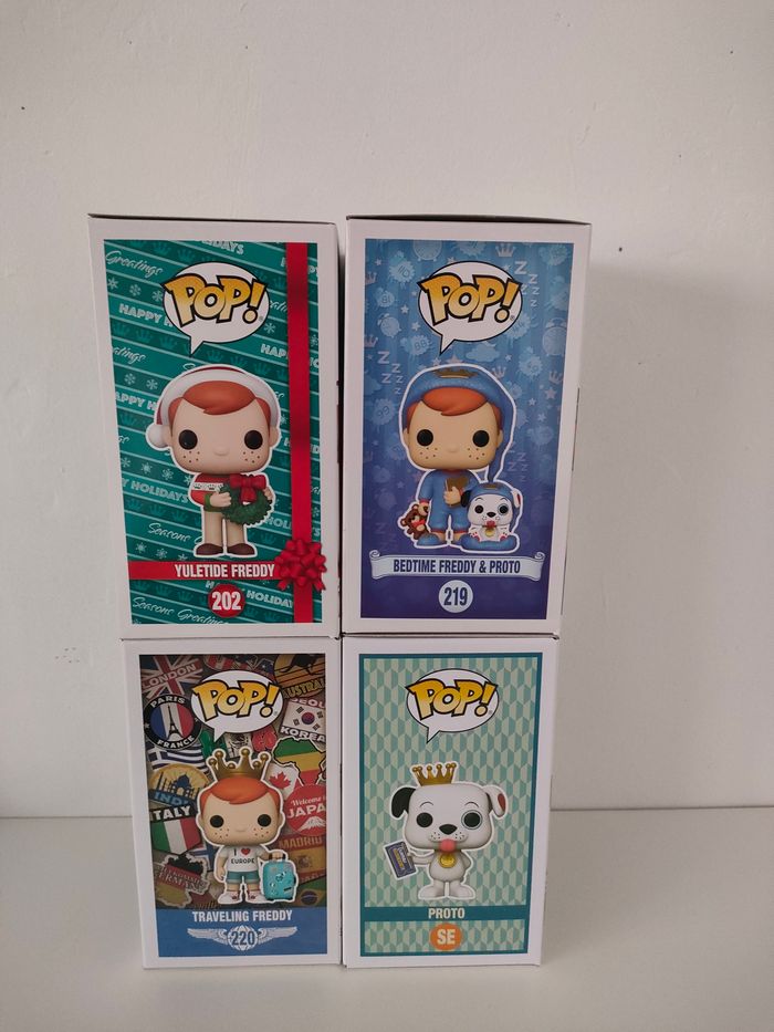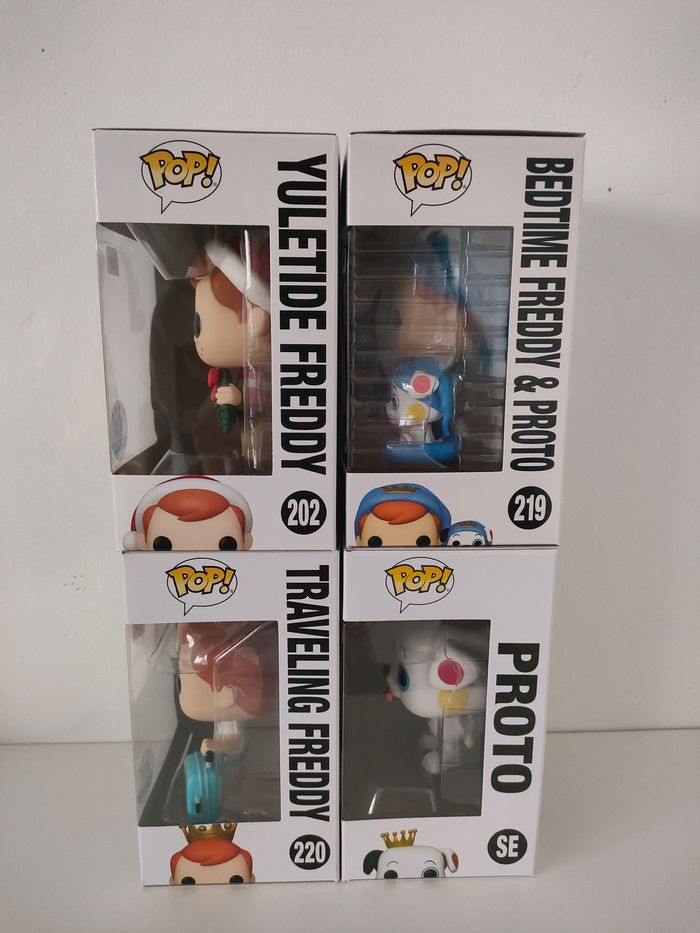 Lot 4 Pops Freddy : 202 Yuletide Freddy, Funko exclusive 219 Bedtime Freddy & Proto, Funko exclusive 220 Traveling Freddy, Funko exclusive SE Proto, 2023 Summer Convention De nombreuses Funko Pops disponibles sur mon profil, réductions sur les lots profitez-en !