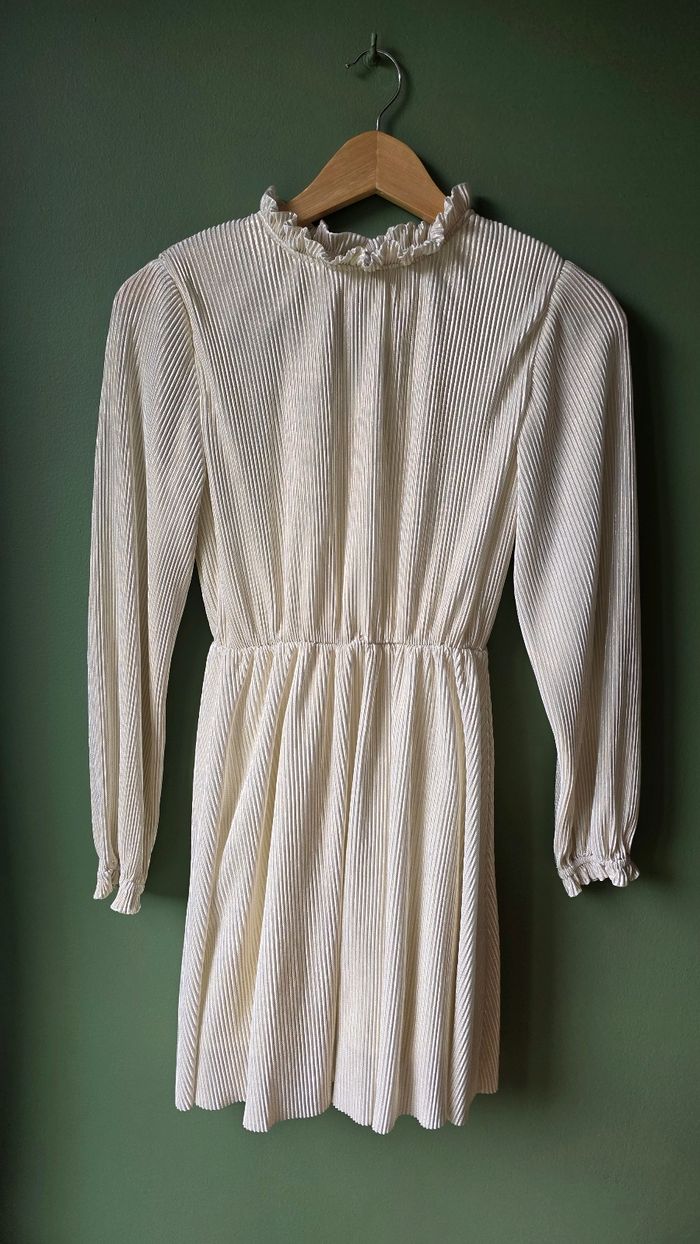Robe plissée ivoire OKAÏDI - Taille 12 ans (152 cm) Très jolie robe fluide et légère de la marque Okaïdi. Coupe évasée avec taille élastiquée, manches longues légèrement bouffantes et finition smockée aux poignets. Col montant à volants, fermeture par bouton au dos. Tissu plissé irisé discret qui capte joliment la lumière. Parfaite pour une cérémonie, un anniversaire ou les fêtes ! État : Excellent état, portée une seule fois. Couleur : Ivoire nacré Taille : 12 ans / 152 cm #okaidi #robeenfant #cérémonie #plissée #fille #12ans #robeivoire