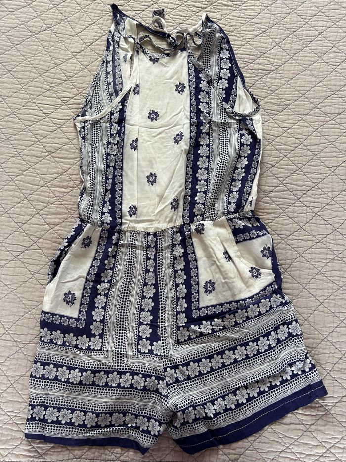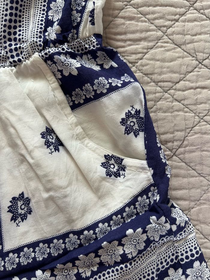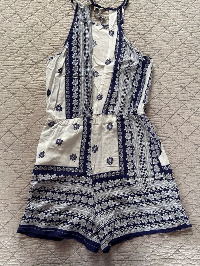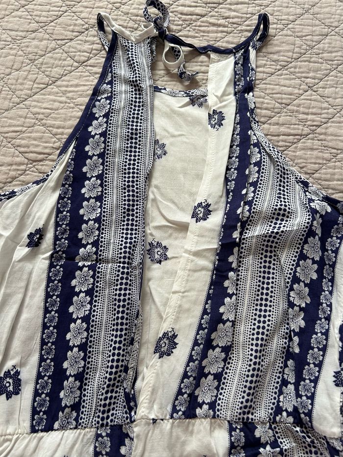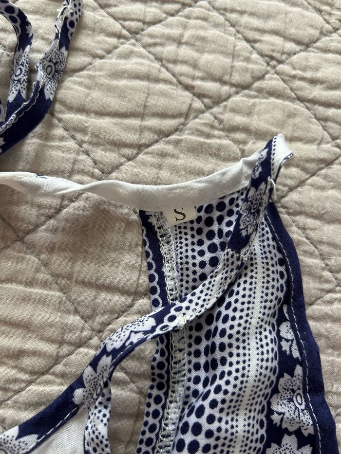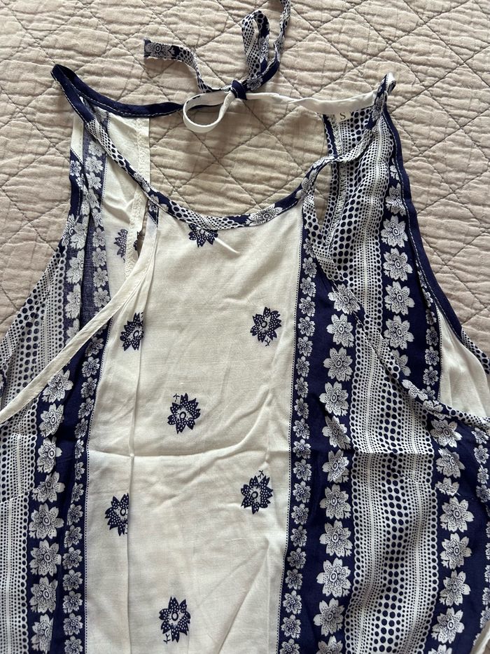 Combi-short femme très légère pour l’été. Taille S. Couleurs bleu foncé et blanc avec motif floral. Sans manches, 2 poches. En excellent état.