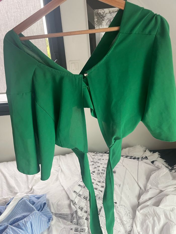 Donne une touche de fraîcheur à ta garde-robe avec cette magnifique blouse verte à nouer. En parfait état, jamais portée. Le tissu est fluide, doux et léger, parfait pour les journées ensoleillées. Le modèle cache-cœur met en valeur toutes les silhouettes et la coupe volante sur les manches ajoute une touche bohème et élégante.