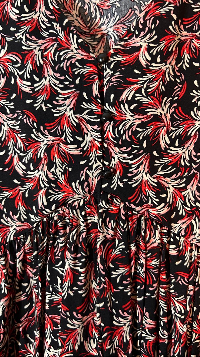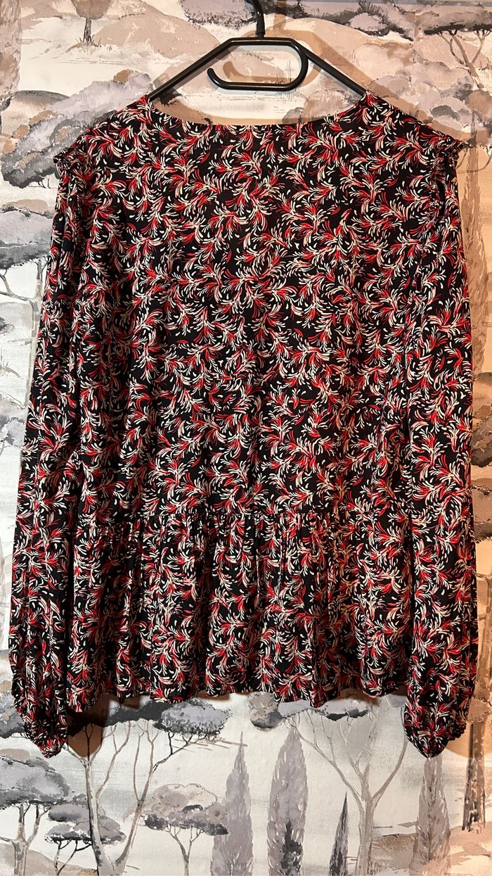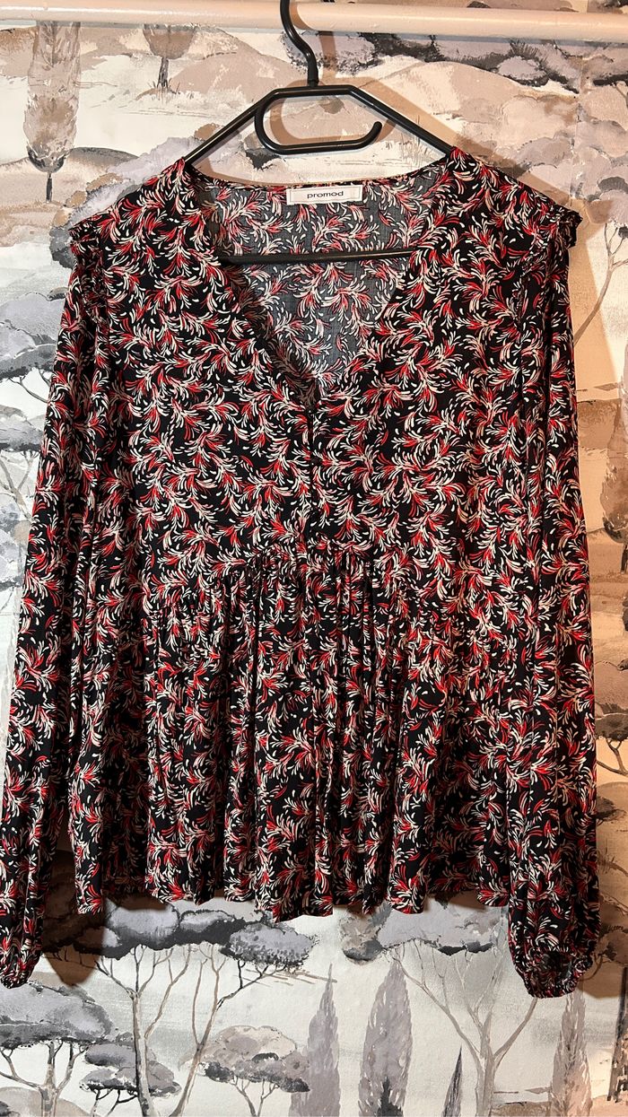 Tunique manches longues, légère, rouge et écrue col V , très agréable à porter marque Promod, taille 38
