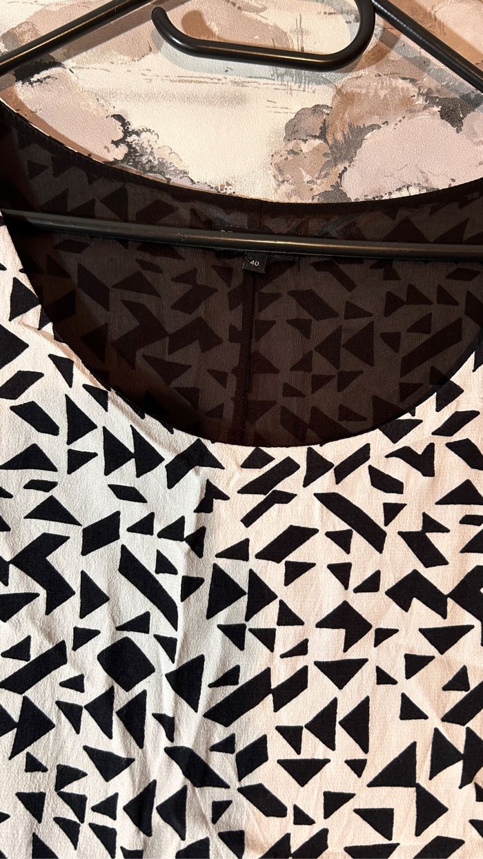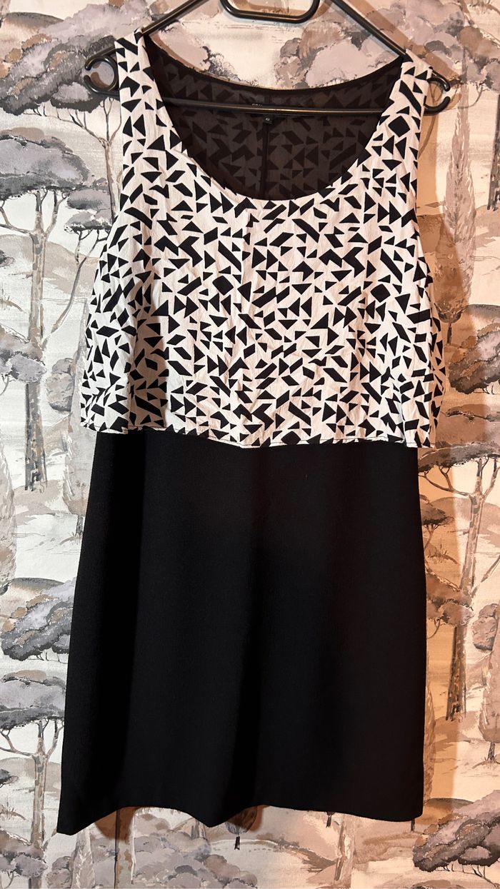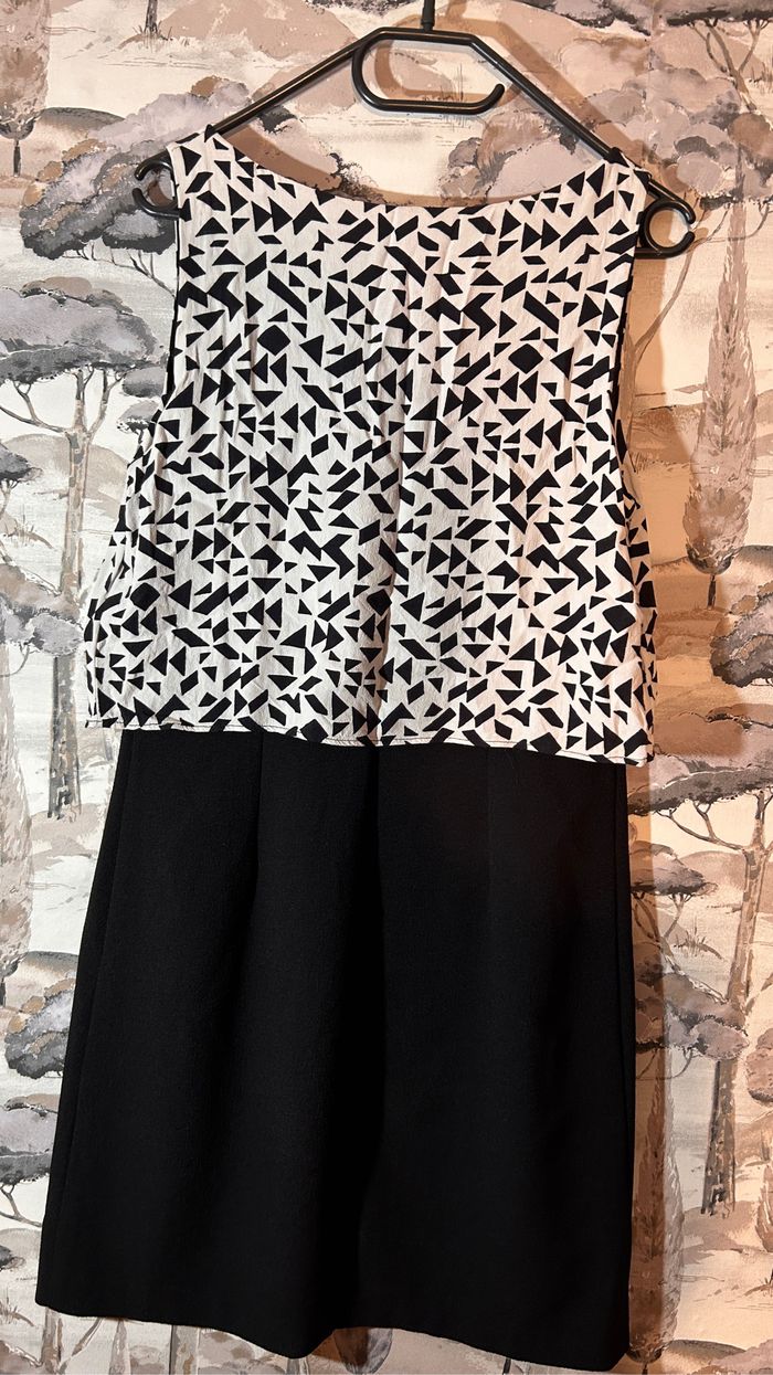 Robe d’été Bi matière, robe noire et au-dessus un tissu noir et blanc, sans manche, grain de malice, taille 40, mais convient à un taille 38, longueur au-dessus du genou