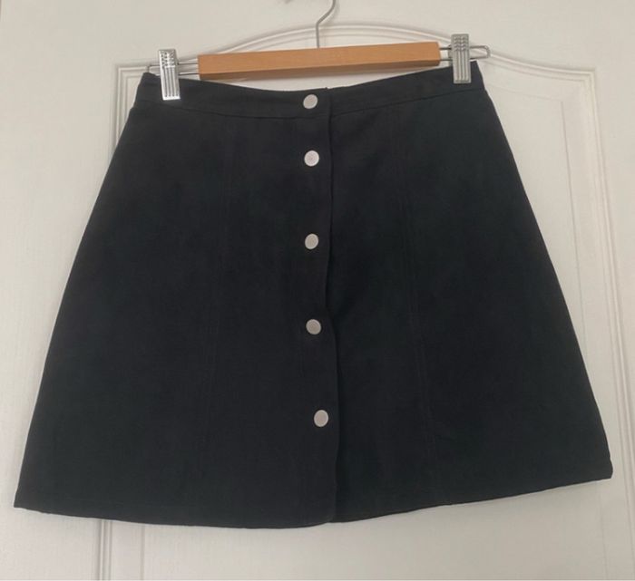 Joli mini jupe type suédine noir de forme trapèze, boutons de pression argenté sur le devant.