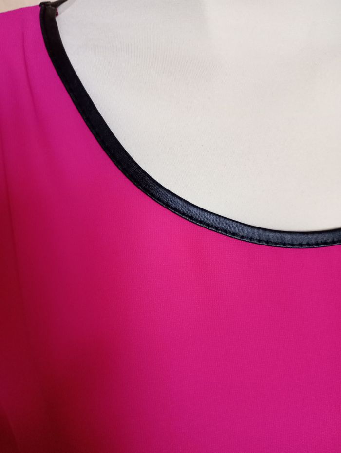 Blouse très légère et transparente en voile fuchsia. Col fin imitation cuir. Pas de taille : Peut convenir jusqu'au 48 (voir mesures). Pas de marque. Longueur : 60 cm. Largeur entre aisselles : 69 cm. Très bon état.
