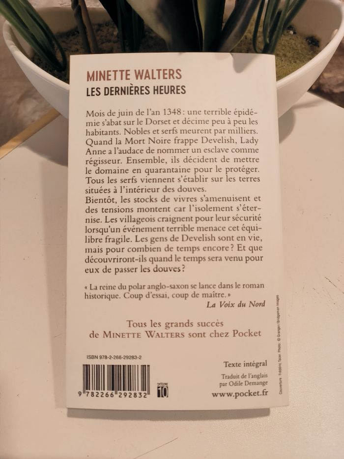 Mois de juin de l'an 1348 : une terrible épidémie s'abat sur le Dorset et décime peu à peu les habitants. Nobles et serfs meurent par milliers. Quand la Mort Noire frappe Develish, Lady Anne a l'audace de nommer un esclave comme régisseur. Ensemble, ils décident de mettre le domaine en quarantaine pour le protéger. Tous les serfs viennent s'établir sur les terres situées à l'intérieur des douves. Bientôt, les stocks de vivres s'amenuisent et des tensions montent car l'isolement s'éternise. Les villageois craignent pour leur sécurité lorsqu'un événement terrible menace cet équilibre fragile. Les gens de Develish sont en vie, mais pour combien de temps encore ? Et que découvriront-ils quand le temps sera venu pour eux de passer les douves ? Biographie: Grande dame du roman noir anglo-saxon, à l'égal de Ruth Rendell et de P. D. James, Minette Walters a été récompensée par de nombreux prix littéraires en Angleterre et aux Etats-Unis. Aux Editions Robert Laffont ont paru, entre autres, Le Sang du renard (2004) ? lauréat du plus prestigieux prix de littérature policière anglaise, le Gold Dagger Award (2003) ?, La Disparue de Colliton Park (2005), Les Démons de Barton House (2006), L'Ombre du caméléon (2008) et Dans la cave (2018). Outre ses romans noirs, elle a également publié Les Dernières Heures (2019) et Au tournant de minuit (2021), un diptyque de romans historiques parus chez le même éditeur.