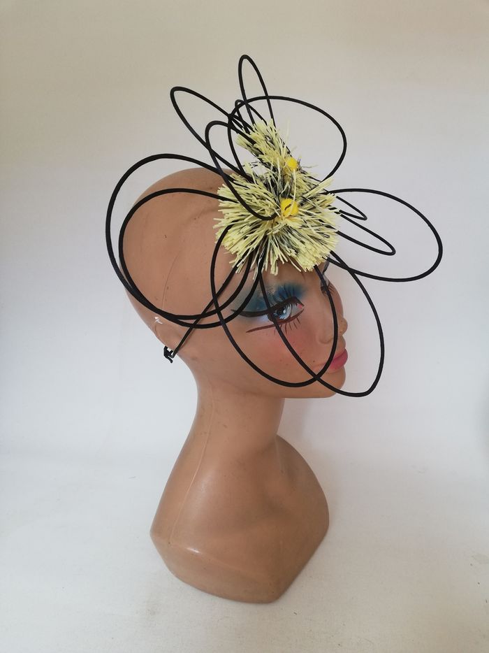 Petit chapeau d'invitée, bibi pour un mariage, une cérémonie, il est de couleur noir /jaune. Un serre-tête réglage permet d'adapter la taille et il peut se porter du côté droit ou gauche. Chapeau de créateur.