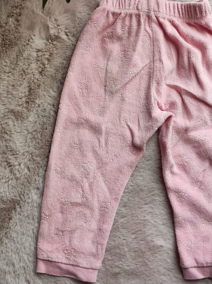 pyjama deux pièces pull et pantalon. Le flocage d'étoiles à un peu disparu par endroit. A l'arrière du pantalon quelques tâches cependant ni troué ou déchiré. 75%coton & 25% polyester. Marque Tex en 18mois. En bon état.