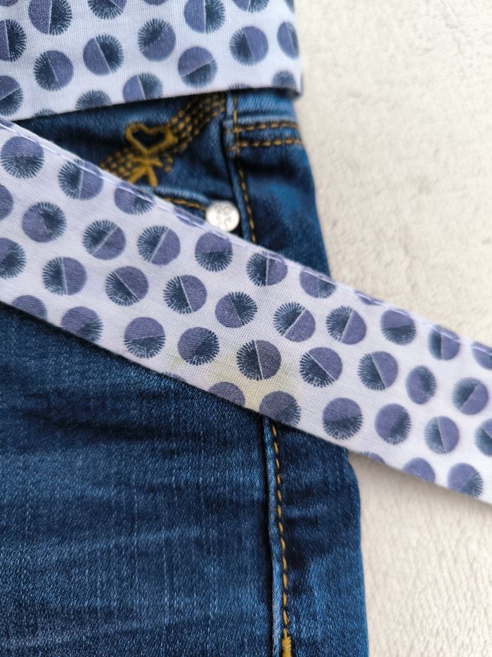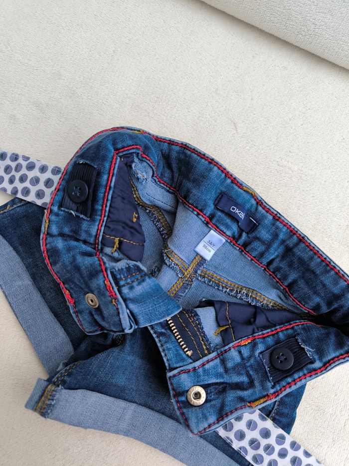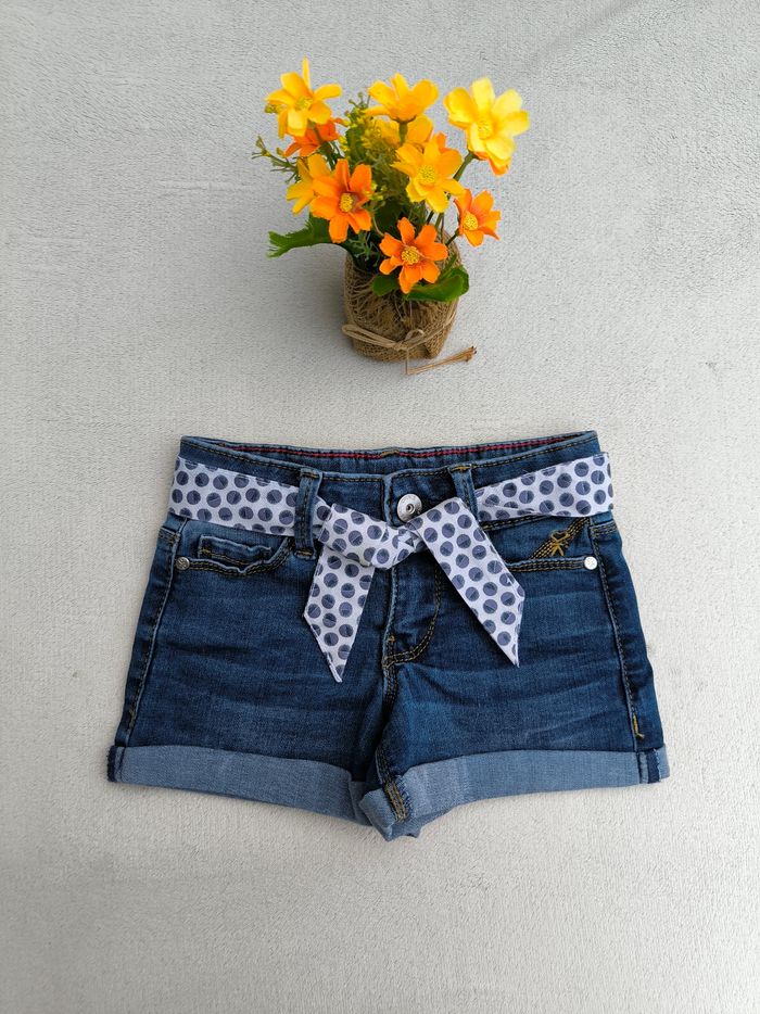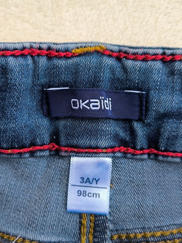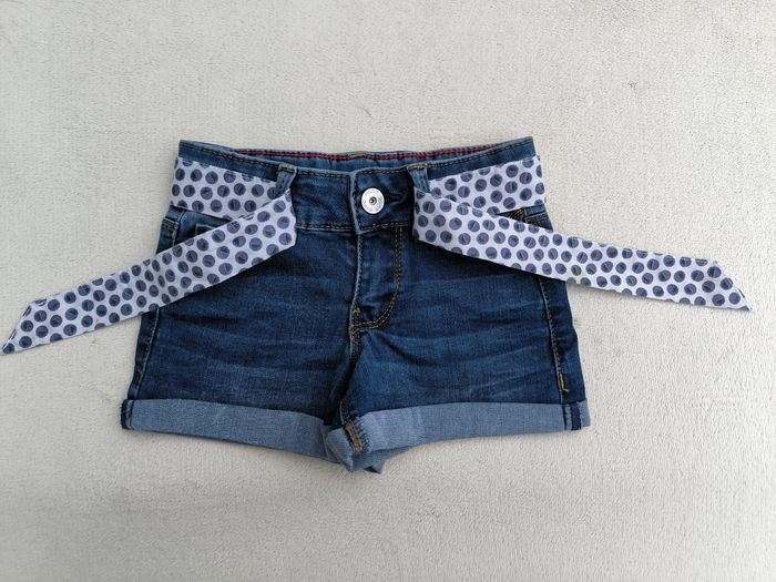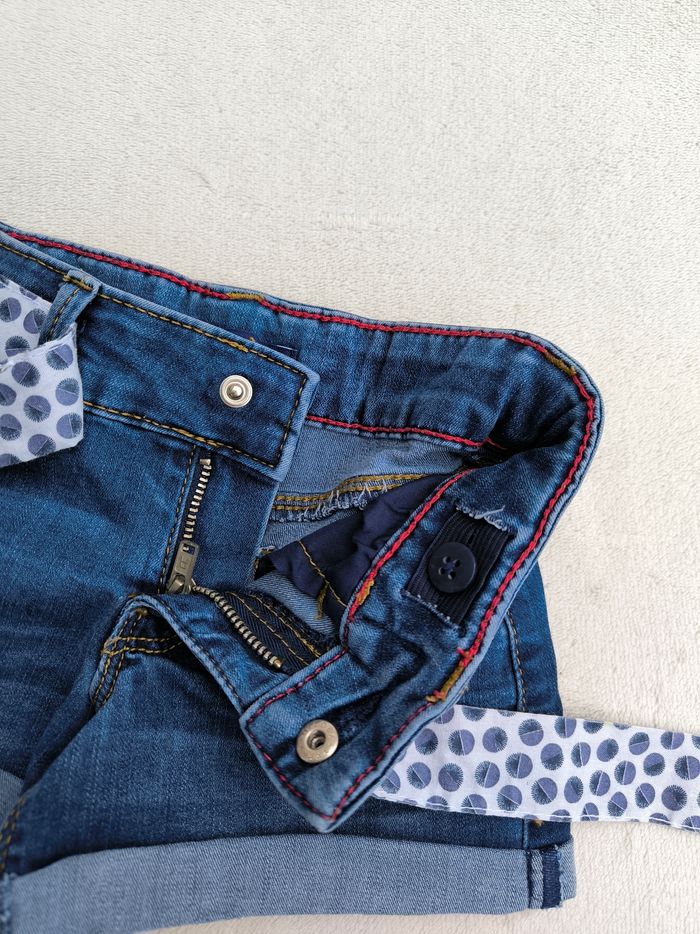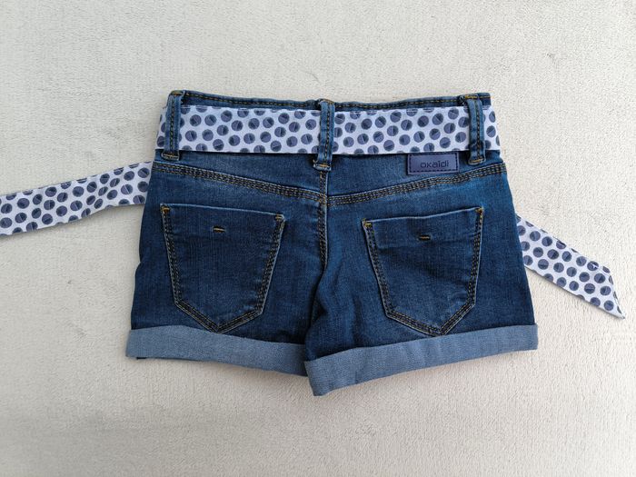 Short en jean Marque Okaïdi Taille 3 ans, 98 cm • Coloris bleu • Fermeture par fermeture éclair et pression • Taille élastique ajustable • 4 poches • Ceinture en tissu avec motifs • Stretch • Petite tache sur la ceinture En très bon état #evelyne_filles_3ans #evelyne_filles