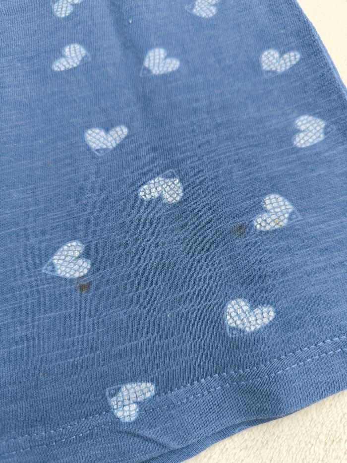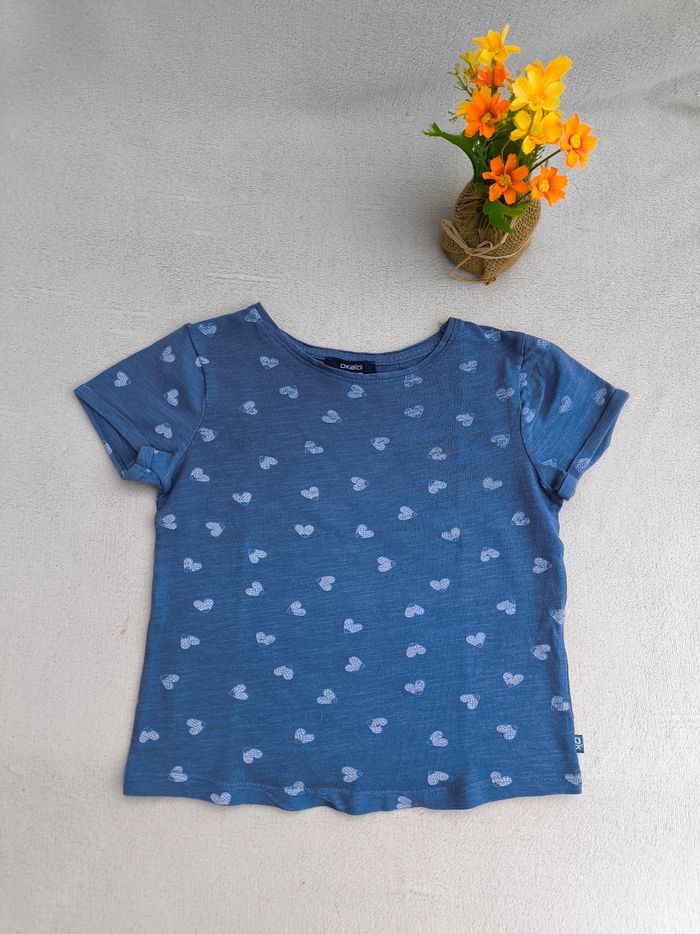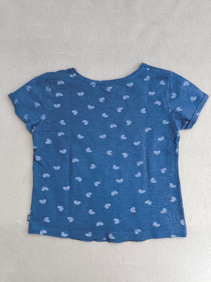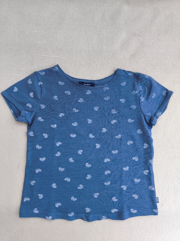 T-shirt à manches courtes Marque Okaïdi Taille 5 ans, 110 cm • Coloris bleu marine • Motifs cœurs • Petites taches au dos En très bon état #evelyne_filles_5ans #evelyne_filles
