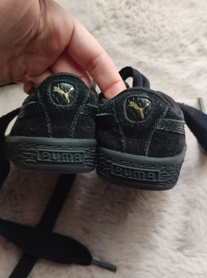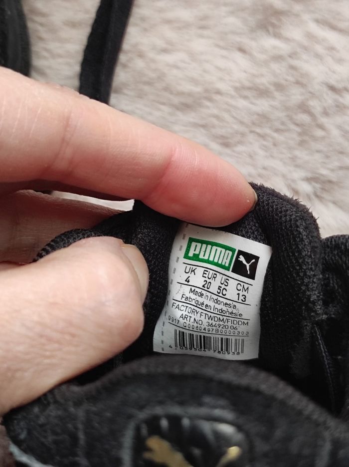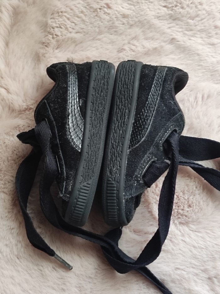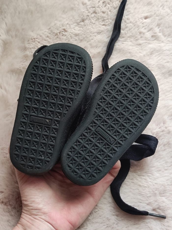 petite paire de baskets noires à gros lacets. A peine porté mais la matière n'est plus d'un noire vif, n'a pas supporté le petit nettoyage, cependant la semelle est intacte. Marque puma en taille 20. Baskets mixte.
