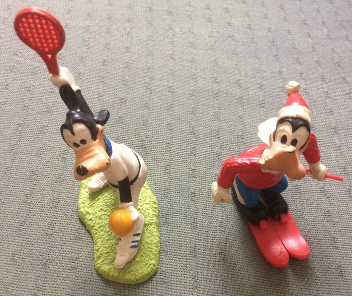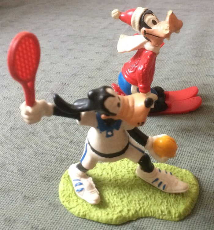 2 figurines Dingo / Goofy : 1 jouant au tennis + 1 au ski (mesurent environ 7 cm) Vintage © Walt Disney Prods Comics Spain Socle (gazon) du tennisman décollé (facile à recoller) Traces d'usures sur les skis + manque 1 bâton de ski et son nez Achat en lot ou à l'unité En livraison ou remise en main propre sur Montpellier