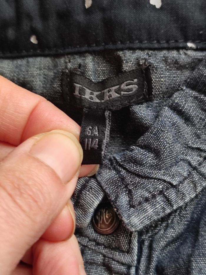 chemise en jeans malléable, manches longues et boutons à pression. Couleur un peu passé par endroits à peine visible. 100% coton Marque IKKS en 6ans