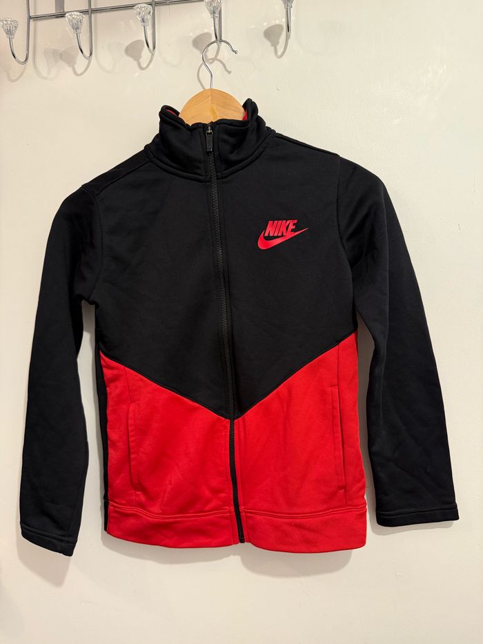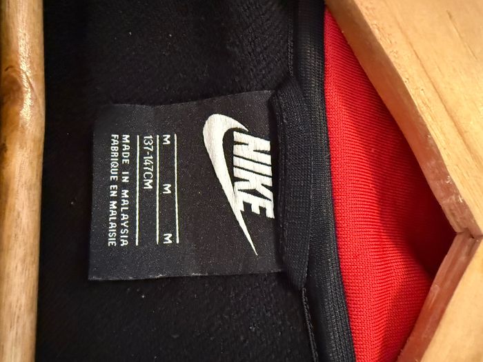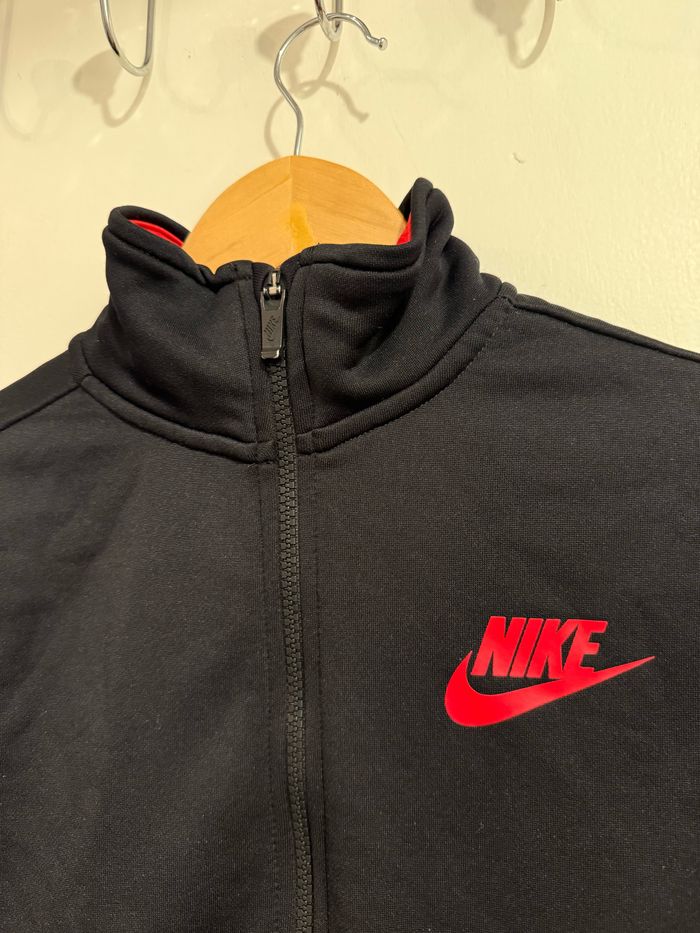 🧥 Veste de jogging Nike 📏 Taille : 9/11 ans … M junior …137-147 cm ⚪ Couleur : noir et rouge 🏷️ Logo : Nike bordé sur la poitrine 🔒 Fermeture zippée, col montant ✅ Très bon état général, idéale pour un look sport ou casual.