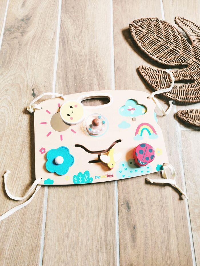 🌞Jeu d'éveil - Planche/panneau en bois multi activités busy board- marque Picwictoys JB686 🎀Convient dès l'âge de 18 mois 🎀Ce panneau en bois offre de nombreuses activités et matières pour éveiller les sens de votre bébé et développer sa motricité fine. ✨Miroir soleil et roue à billes ✨Roulette latérale pour changer de dessin ✨ Labyrinthe avec petit oiseau ✨Un fleur en feutrine et une jolie coccinelle 🎀Grâce à ses attaches, vous pourrez le fixer au parc/lit de bébé. ❇️N'hésitez pas à créer un lot pour économiser sur les frais de port❇️ Premier âge, Jouet bébé, Jouet d'activité, Jouet ludique, Jouet eveil, Mémorisation, Memoire, aptitude, motricité, jeu Adresse, Montessori, jeu bois, Jouet bois, Jouet vintage, Jeu adresse, jeu apprentissage, dextérité, jeu sensorielle, jeu educatif, activités et Jouet pour bébé, trier empiler, encastrer, jeux et jouets