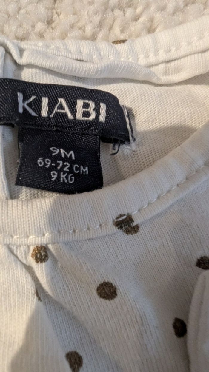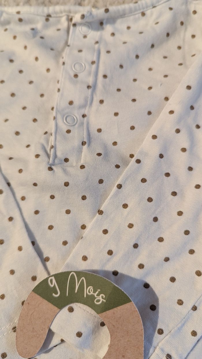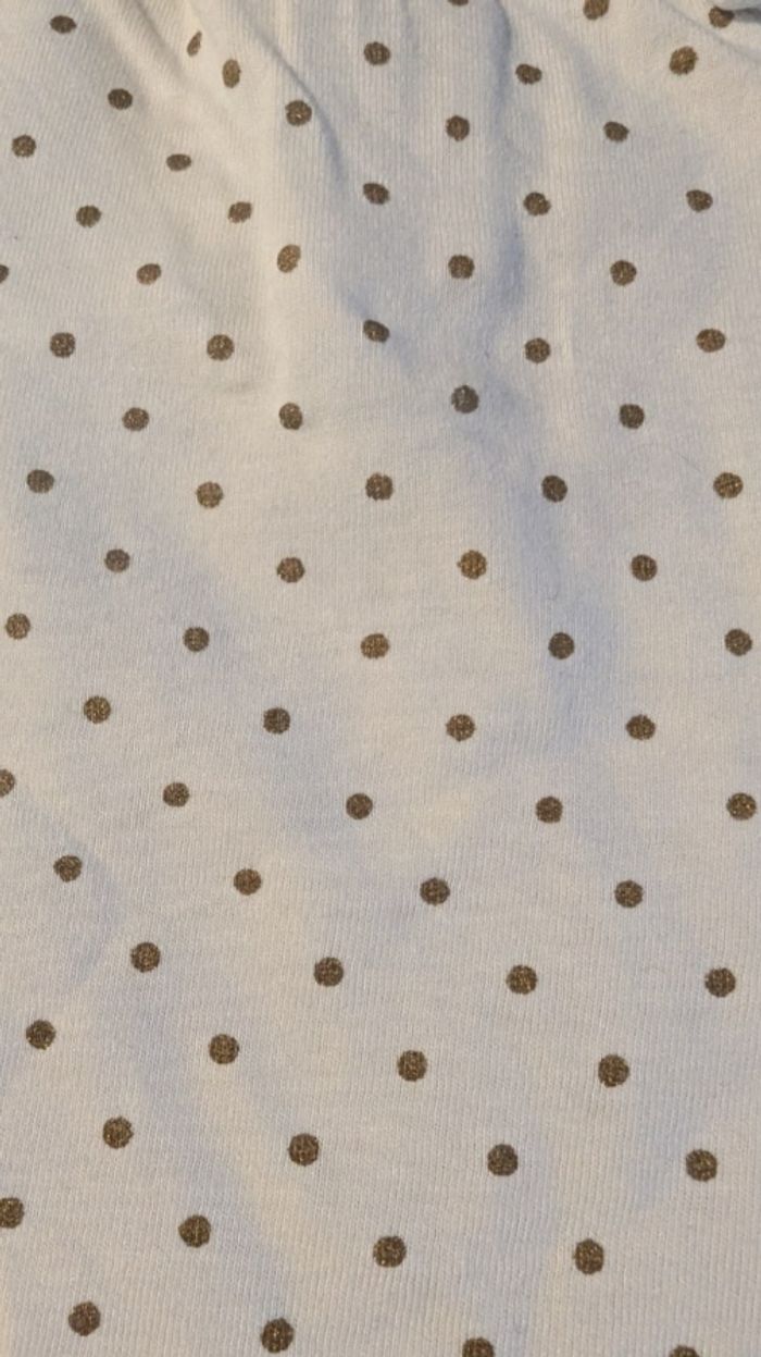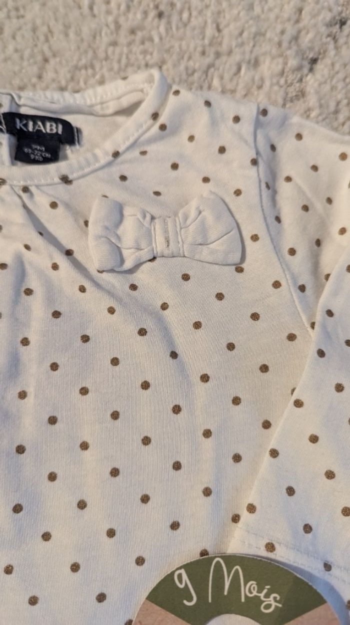 T-shirt manche longue blanc à pois doré Kiabi en coton. Petit nœud cousu en relief devant. Fermeture à pression dans le dos