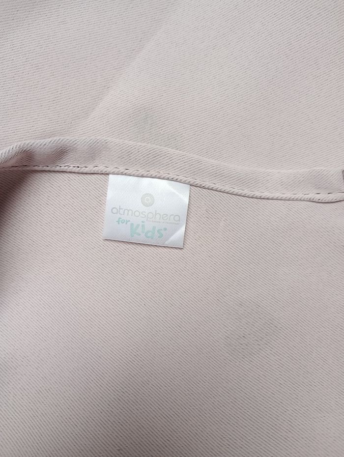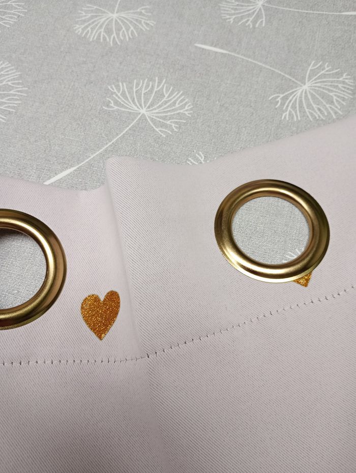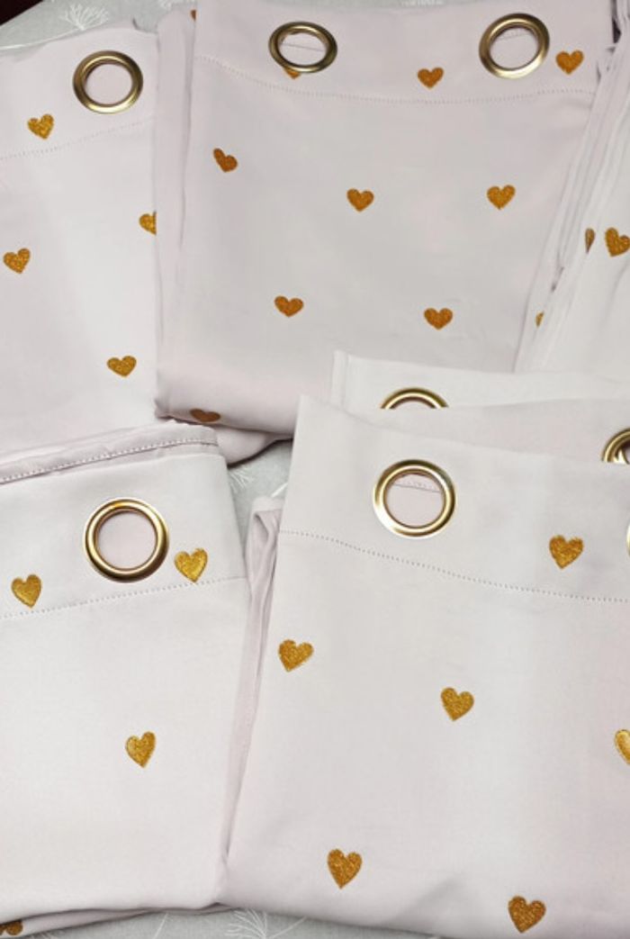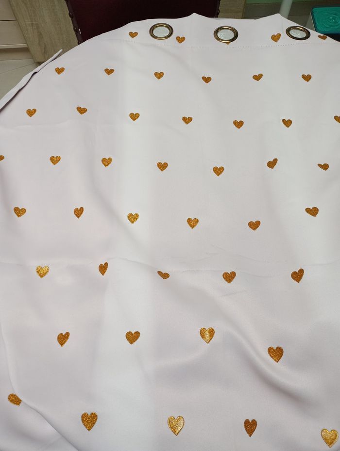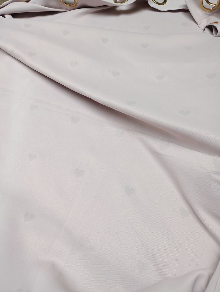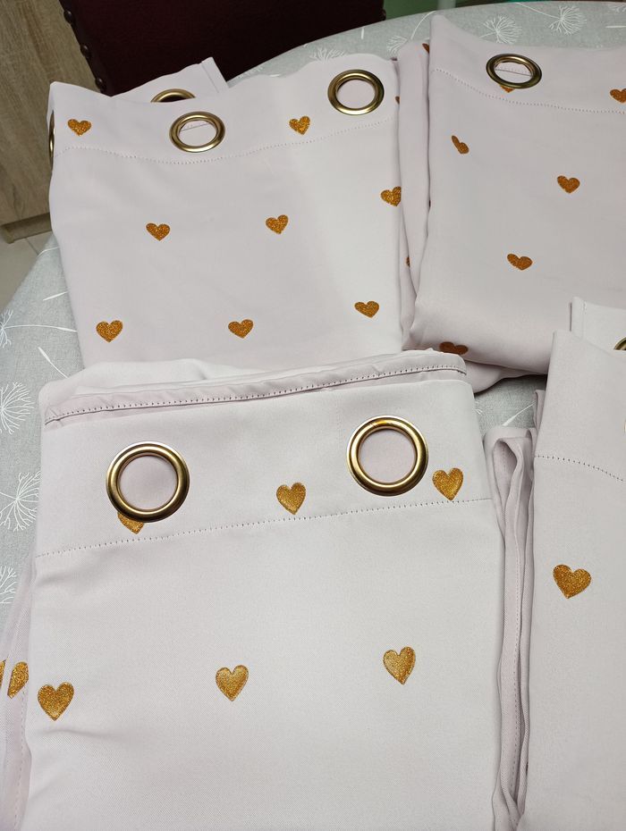 Lot de 4 tentures (ou rideaux). Elles sont épaisses, occultantes, de très bonne qualité. Rose pâle avec cœurs dorés en reliefs. Dimensions par tenture : 140 x 250 cm. Marque : Atmosphera for Kid's. Elles sont en bon état, ni taches, ni trous mais une très légère décoloration au niveau des pliures due au soleil. Prix d'achat par pièce : 20 €. 10€ pièce ou 30€ les 4.