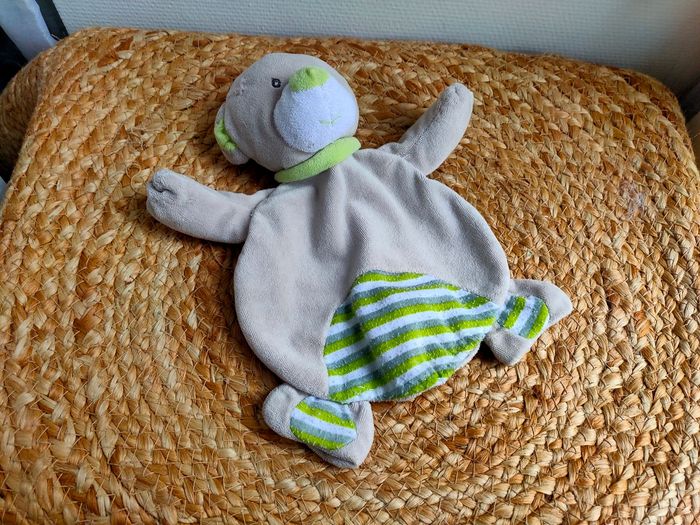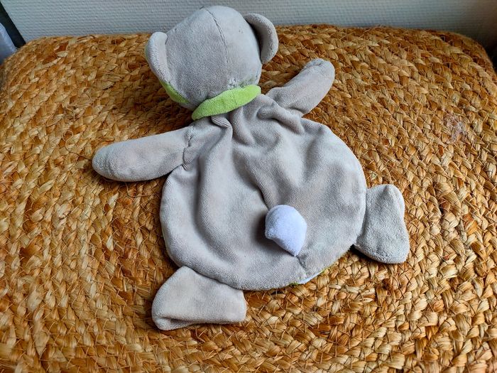 Oursons plat coloris beige et vert, marque Baby nat'. Normalement il a un Bonnet, malheureusement celui-ci a été égaré, l'étiquette Baby nat' a quand a été été coupé. Le Doudou est malgré tout en très bon état. Prix ferme, PAS DE NÉGO !!!