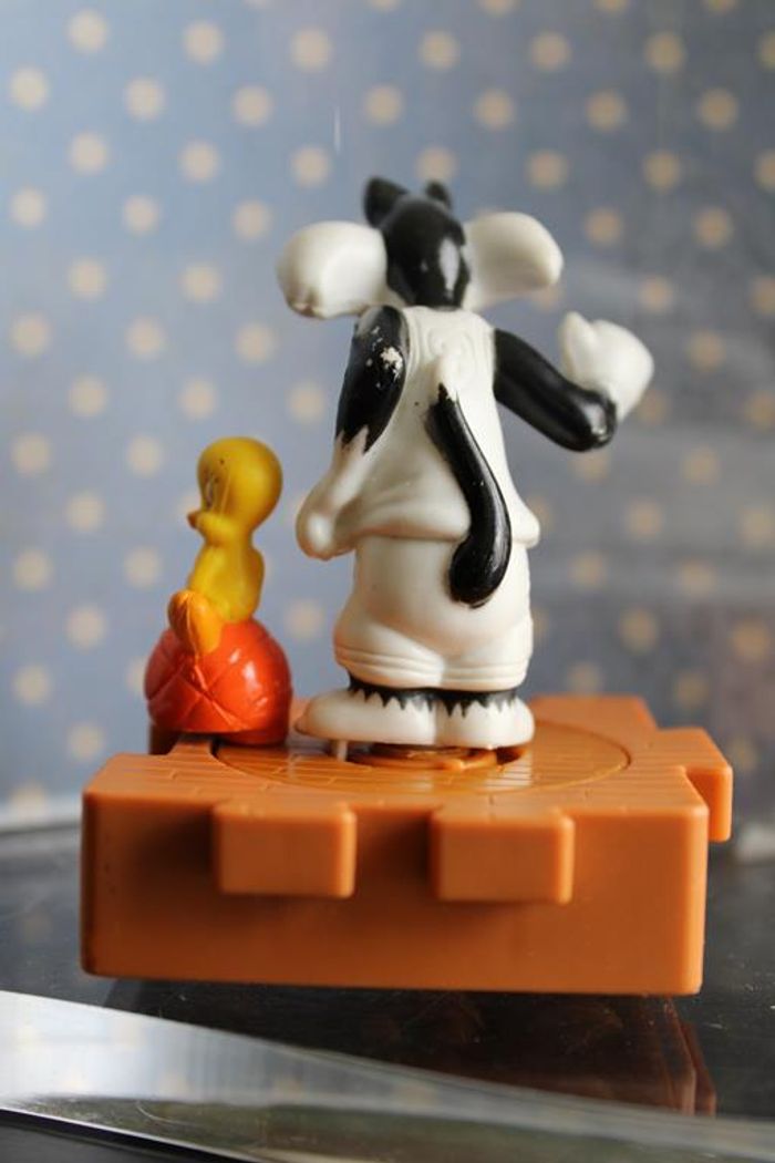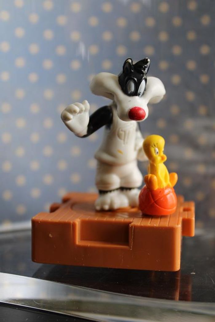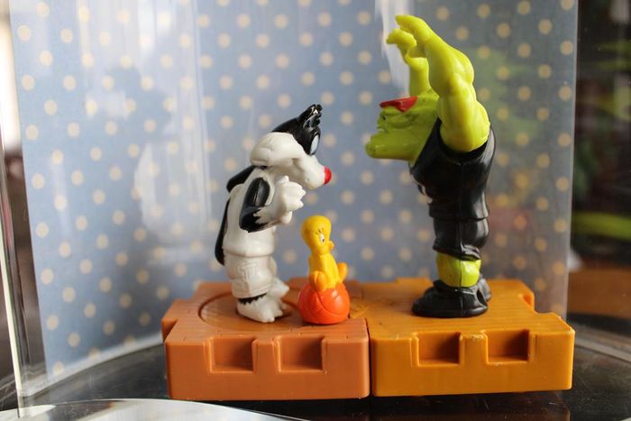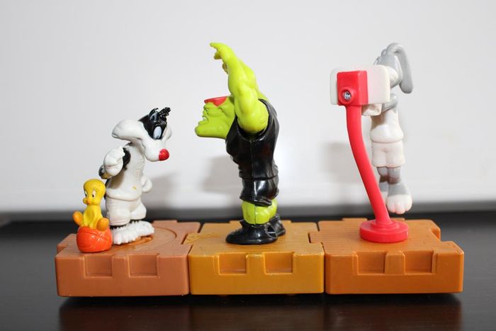 Lot composé de 3 figurines offertes avec un menu enfant dans une chaine de restauration rapide en 1996. En bon état, les figurines s'animent quand on les fait avancées. Bugs bunny tourne Titi tourne autour de Grosminet. L'alien vert bouge les bras.( traces d'oxydation sur les vis). les figurines peuvent s'assembler pour créer des phases de jeu Ces figurines peuvent avoir des manques de peinture. Réponds avec plaisir aux demandes d'informations complémentaire Réponse rapide envoi soigné dans les meilleurs délais