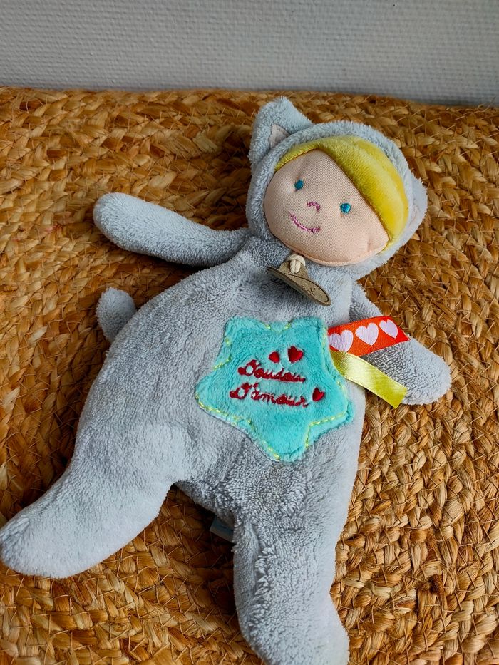 Doudou poupée déguisée en ours gris, cheveux blonds, capuche à oreilles amovible, étoile bleue brodée Doudou d'amour, étiquettes. Il est en très bon état. Taille : 22cm environ Prix ferme, PAS DE NÉGO !!!!