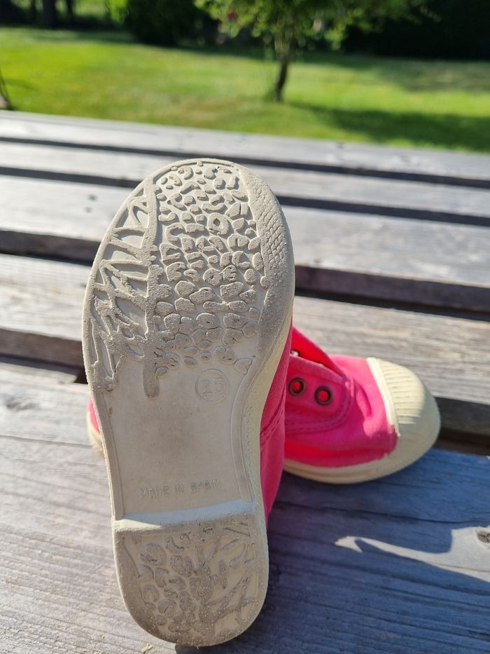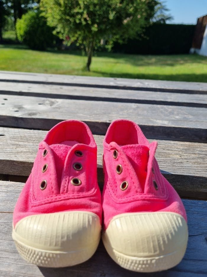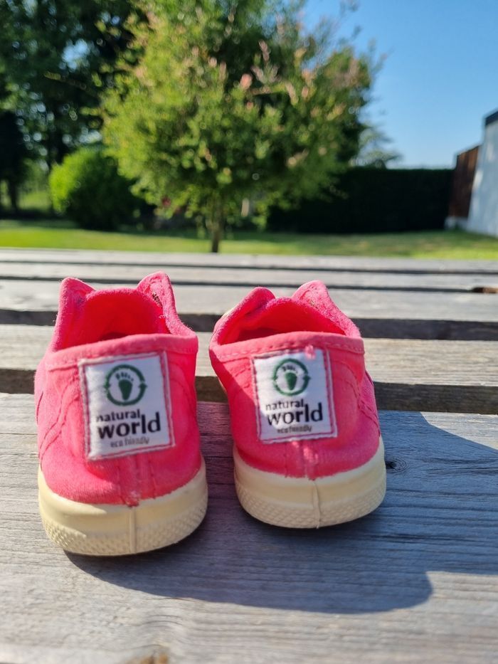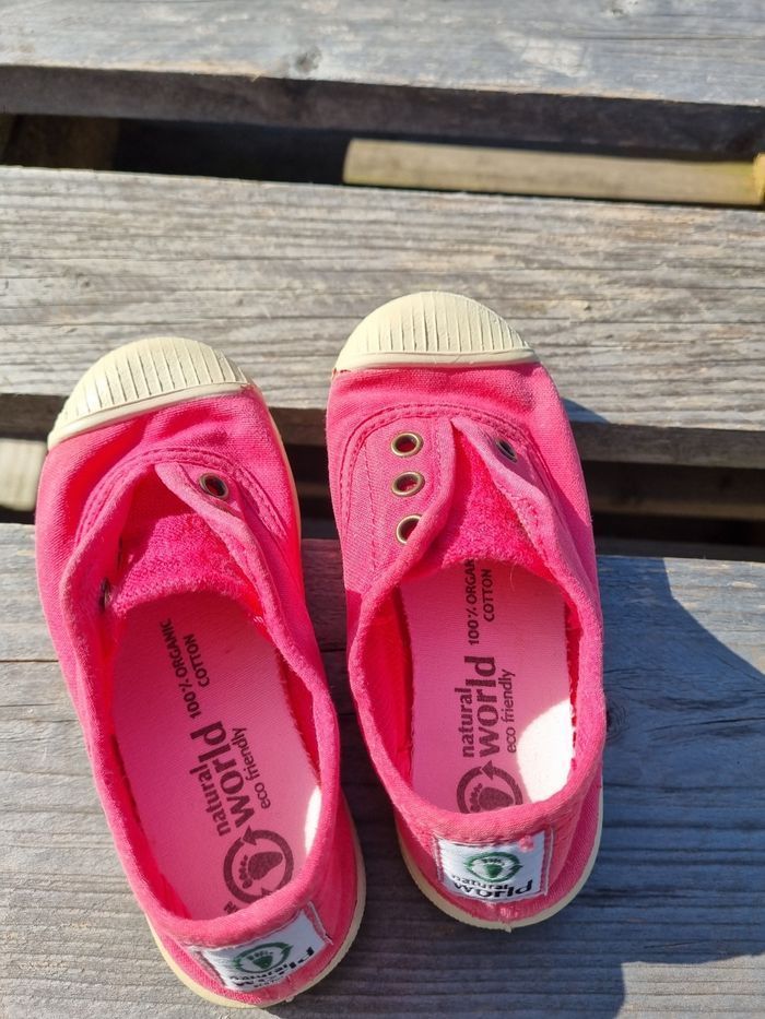 Vends paire de tennis pour enfant de la marque Natural World, en toile de coton de couleur rose, semelle amovible, lavable facilement. Très bon état, bout renforcé. Pointure : 25