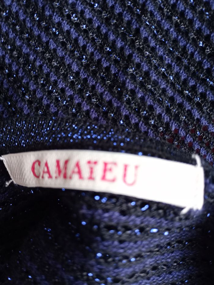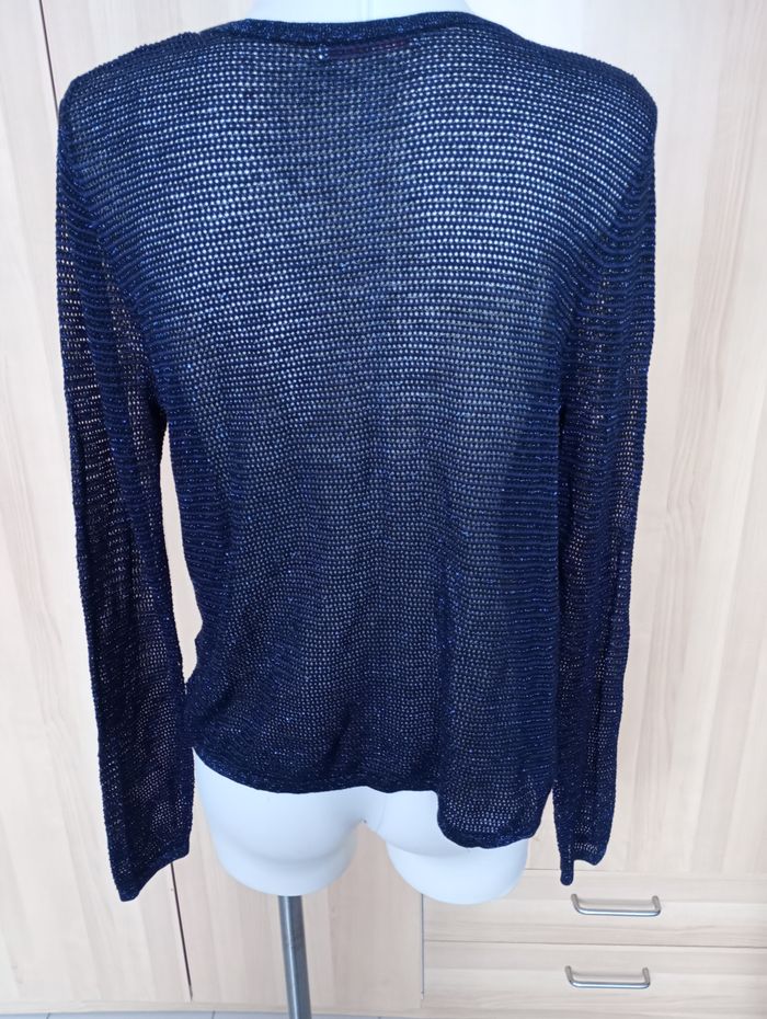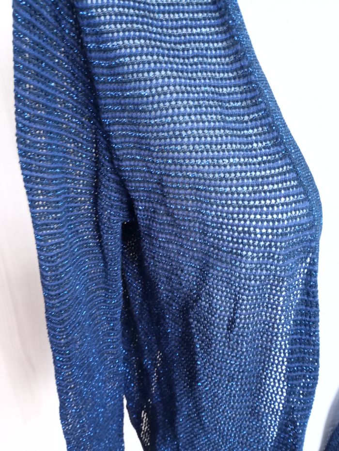 Gilet en mailles, bleu pailleté. Pas d'étiquette de taille, devrait correspondre à un 40-42. Longueur : 60 cm. Largeur entre aisselles : 51 cm. Marque : Camaïeu. Très bon état.