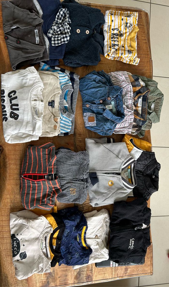 Bonjour je vend un lot de vêtements pour garçons taille 6 mois : Il y a 38 pieces - 5 pulls - 4 chemises manche longue - 4 vestes - 1 doudoune sans manches - 4 teeshirt manches longues - 1 tee teeshirt manches courtes - 5 legging - 11 pantalons - 1 maillot de bain - 2 salopettes pantalons
