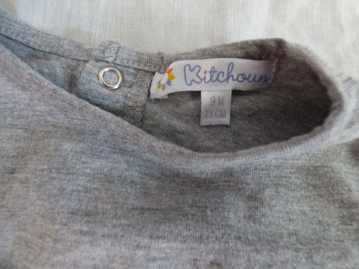 TEE-SHIRT BEBE FILLE KITCHOUN 9 MOIS COULEUR GRIS MATIERE 90% COTON 10% VISCOSE FERMETURE PAR BOUTON DANS LE DOS MESURE DU VETEMENT ( VOIR PHOTOS) TRES PEU PORTER, EN TRES BON ETAT NUMERO 19 N'HESITEZ PAS A ME CONTACTER SI VOUS AVEZ DES QUESTIONS.