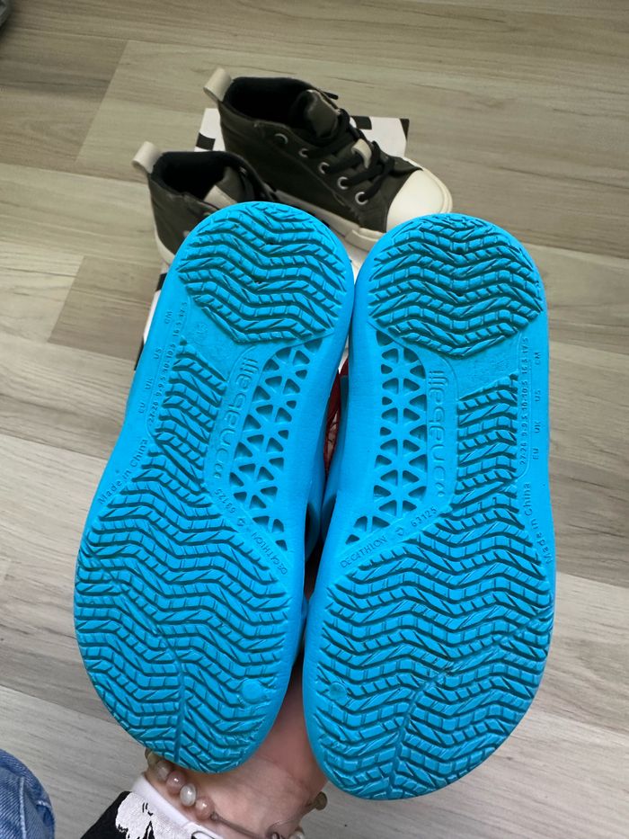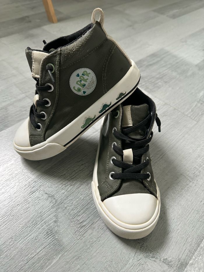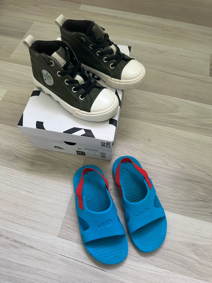 Lot chaussures garçon taille 27 en très bon état: Chaussures kaki sans lacets à enfiler Gémo Sandales taille 27-28 Nabaiji Décathlon, ne craignent pas l’eau, avec attache à l’arrière.