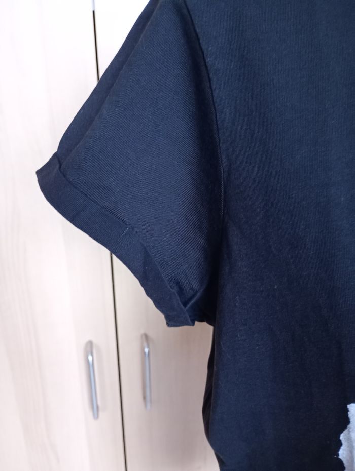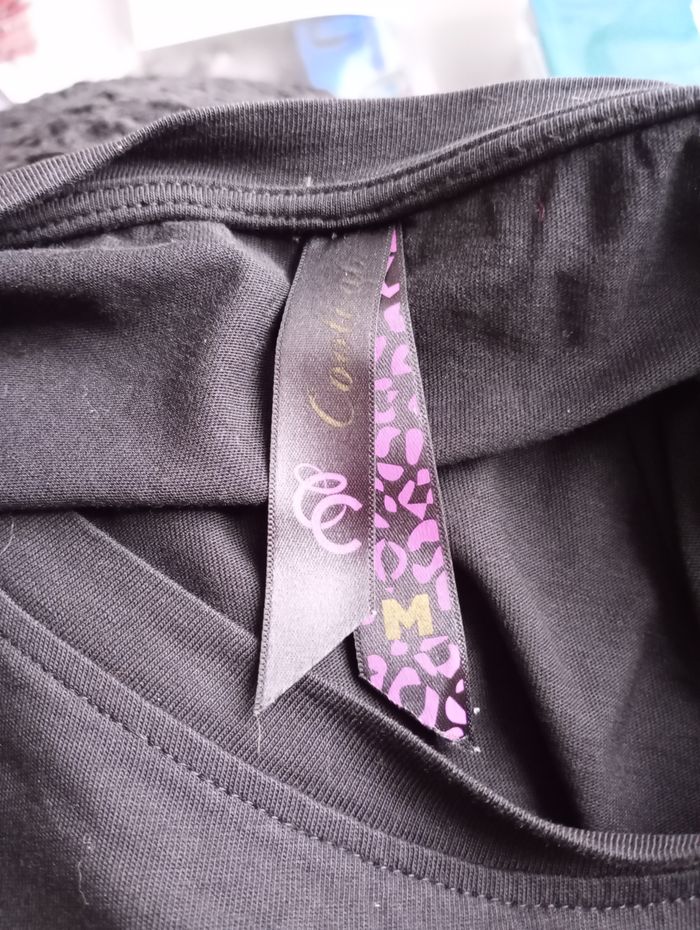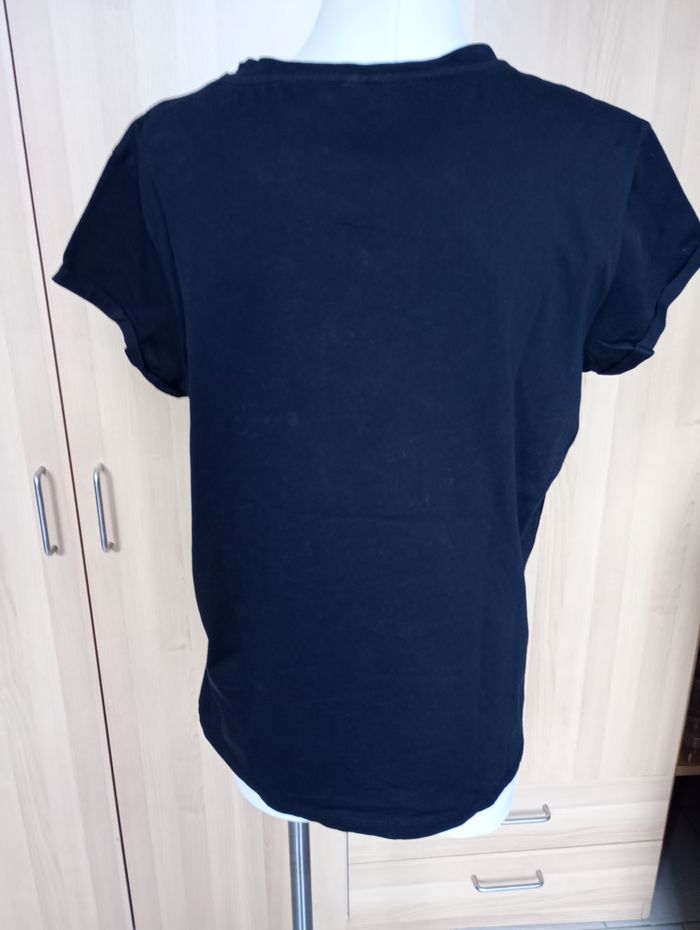 T-shirt noir avec inscription "Lady". Se porte assez large. Taille : M. Marque : Cool Cat. Longueur : 67 cm. Largeur entre aisselles : 53 cm. Très bon état.