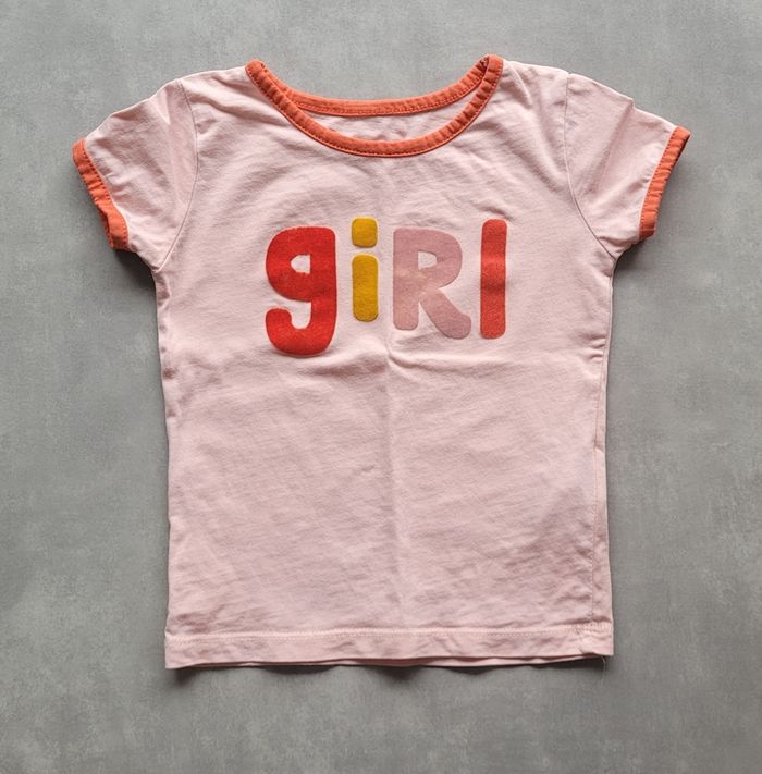 T-shirt manches courtes, de couleur rose avec inscription en velours, de la marque Gémo, taille 4 ans, en très bon état. Article lavé pour la vente.