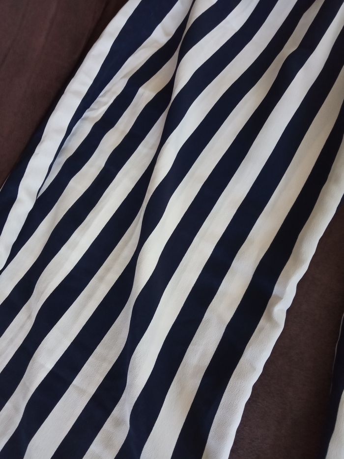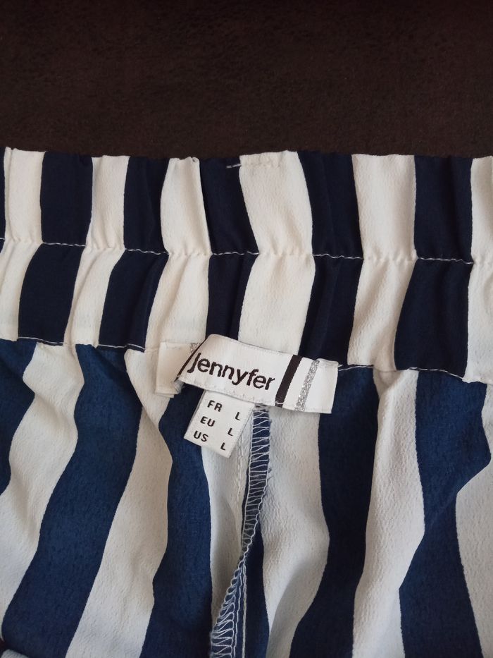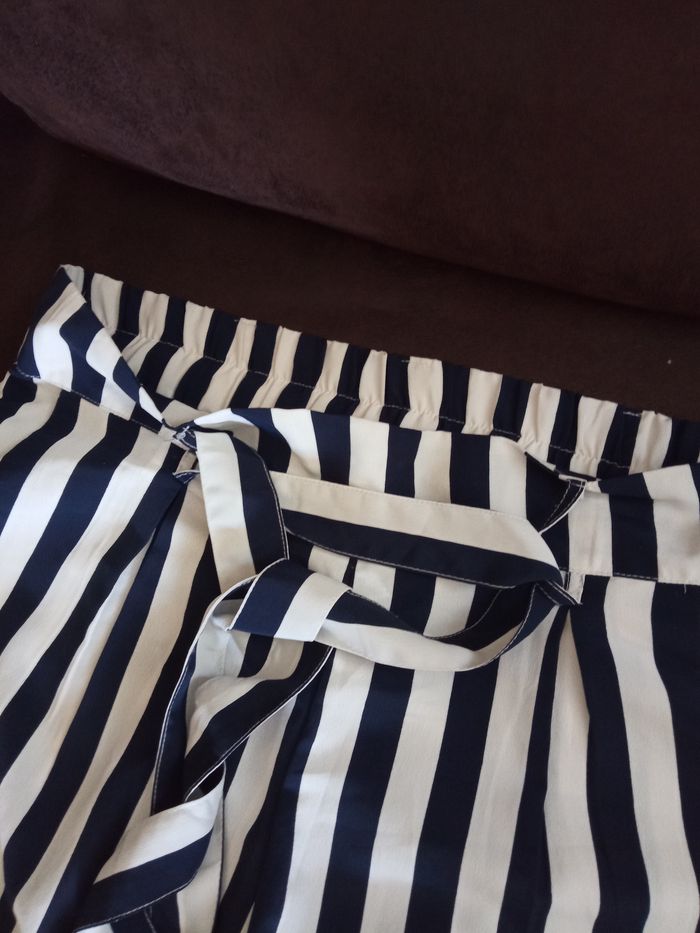 Ravissant Pantalon Taille L "Jennyfer" Couleur: Bleu Marine et Blanc à rayures Taille élastiquée derrière, passants à la taille avec ceinture tissu assortie S'enfile, 1 poche de chaque côté Ample, léger et fluide, jambes larges Lavable en machine à 30 Dimensions: Longueur 104cm - Entrejambes 72,5cm - Taille non étirée 42,5cm - Hanches 58,5cm environ Matière: 100% Polyester PANTALON comme Neuf, porté 1 fois, vendu comme sur les photos