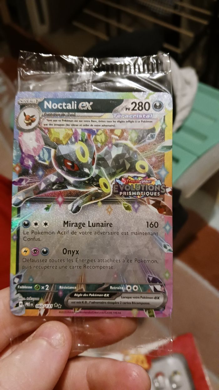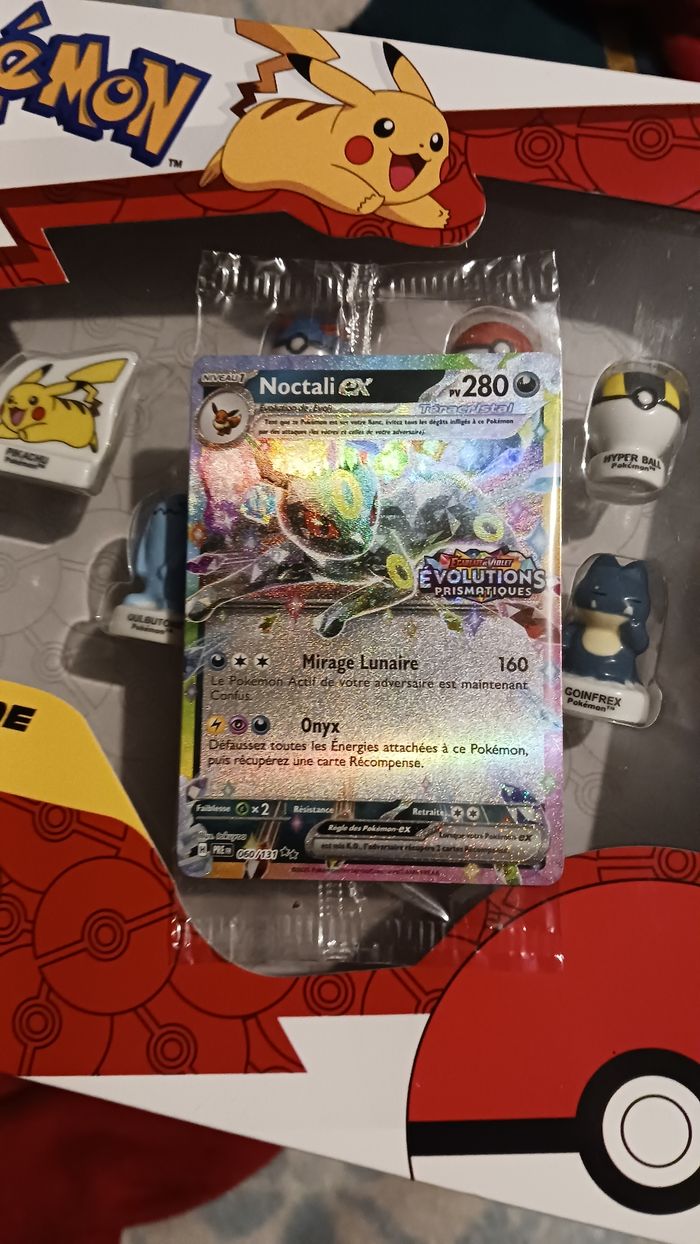 Les deux sont vendus ensemble carte pokémon Noctali avec le logo évolution prismatique sortie de coffret Pokémon et pour tout âge