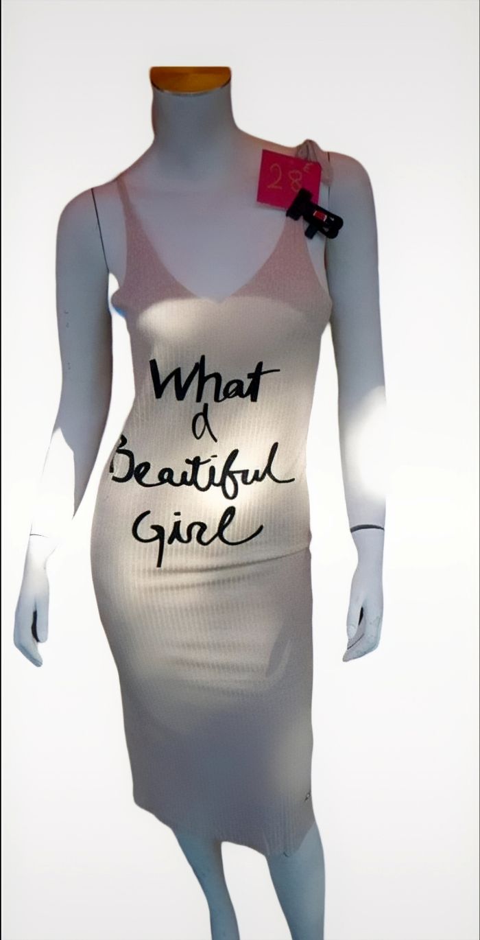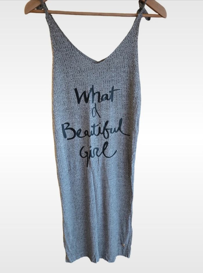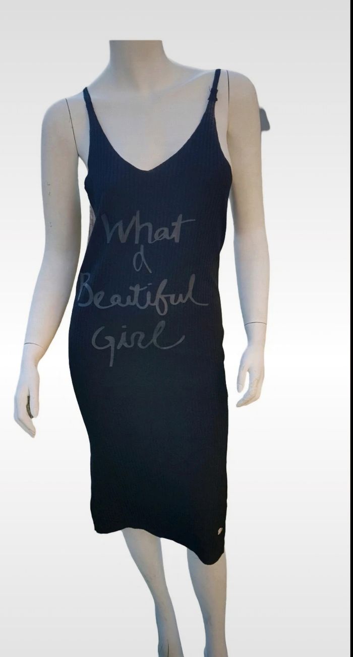 Produit neuf etiqueter Robe longue legere tres fashion Ecriture sur le devant Fendu en bas Petit logo tour eiffel en bas, sur le devant. Matiere: 61,4 % viscose , 33 % polyester, 5,6 % lycra Coloris : noire , grise et creme Taille : S/M ou M/L PRIX : 20€