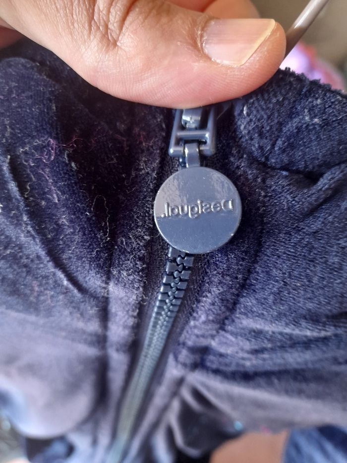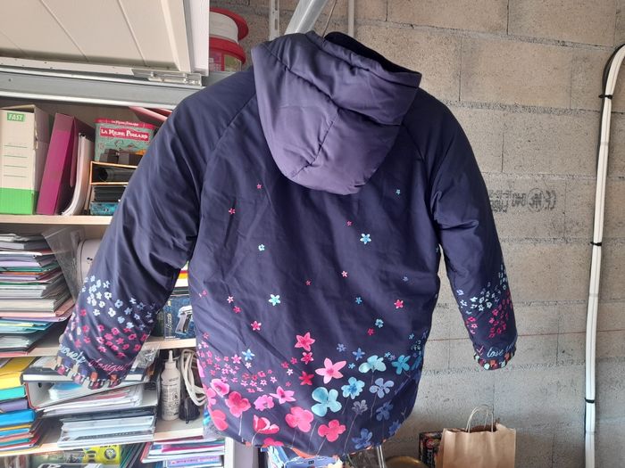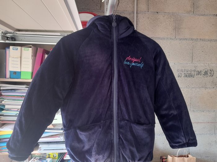 Très joli blouson fille de chez desigual en 8ans.en bon état, il est réversible.bleu marine un côté fait effet velours.l'autre côté est bleu avec motifs de fleurs multicolores.avec une capuche, il est en très bon état juste un petit trou vers la pocje de droite mais qui ne dénature en rien le blouson.