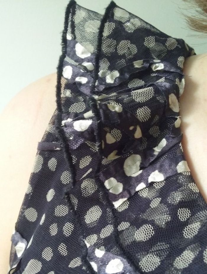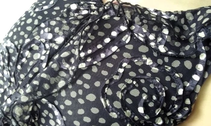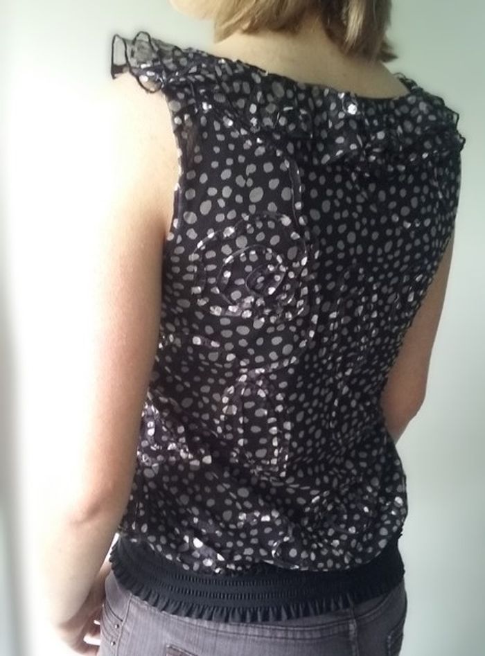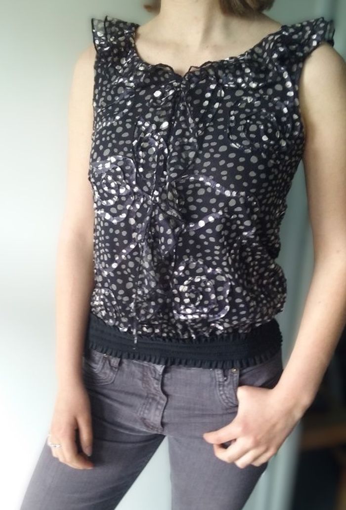 Joli haut noir et blanc, à volants et ceinture élastiquée, taille 38 mais peut convenir également à un 36!