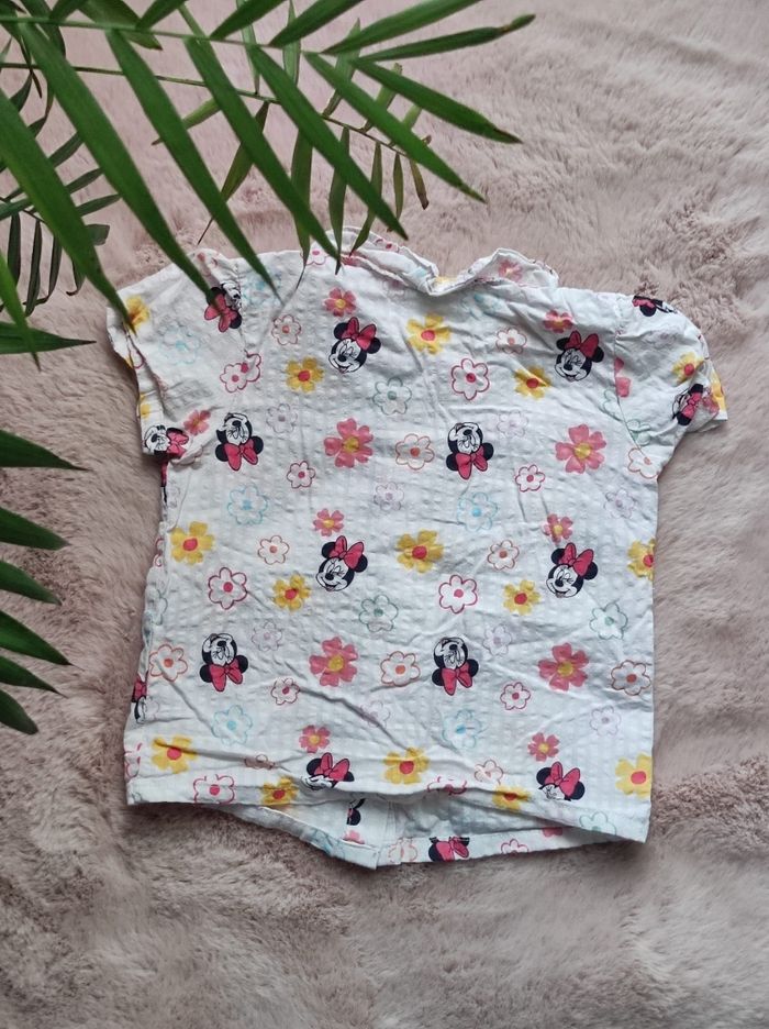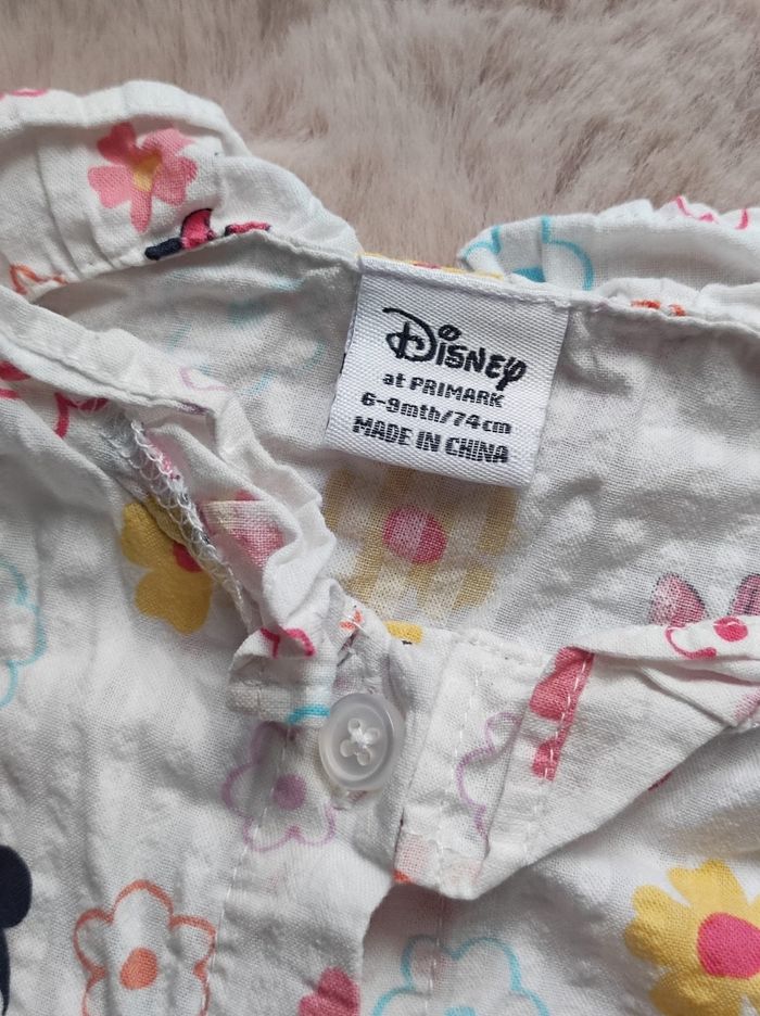jolie Petite chemise imprimée minnie et fleurs sur fond blanc, à boutons et manches très courtes. Marque Disney en collaboration avec primark. Taille 6-9mois Peu porter