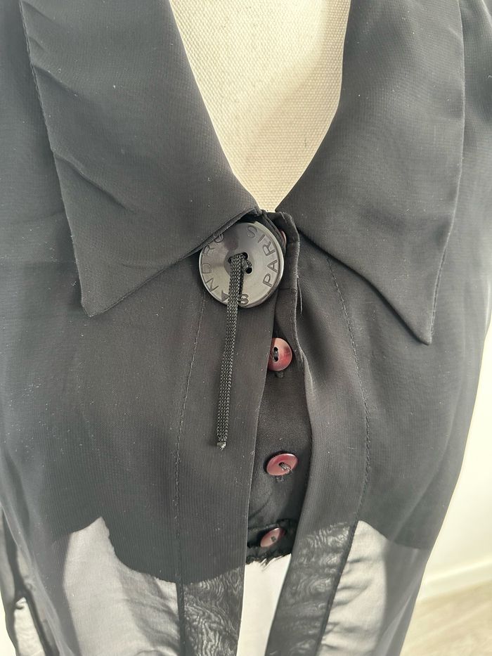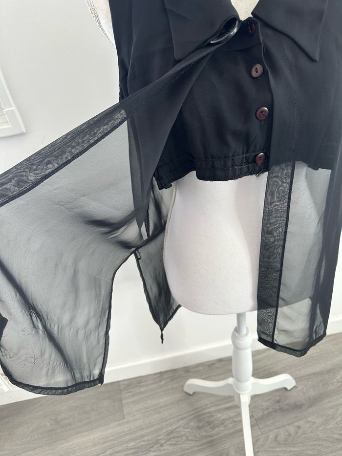 Chemisier - Excellent état - Taille 38 équivalent M - Sandro Vintage (ancienne étiquette de la marque) - Couleur noire - Effet crop top et voile long - Etiquette de taille et de composition illisible - Bouton floqué Sandro Paris Dimensions: - 48cm niveau aisselles - 39cm de long niveau crop top - 73cm longueur totale