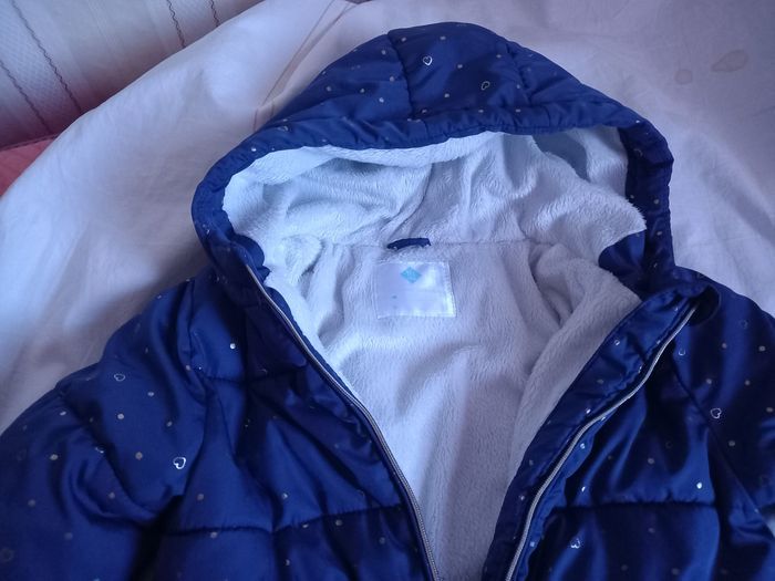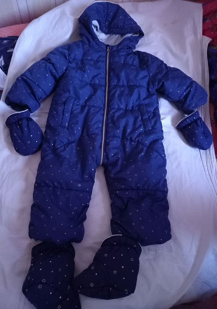Combinaison-pilote TEX 12 MOIS bleu marine avec cœurs et points dorés, doublée, fermeture éclair devant, capuche, bottillons et moufles amovibles