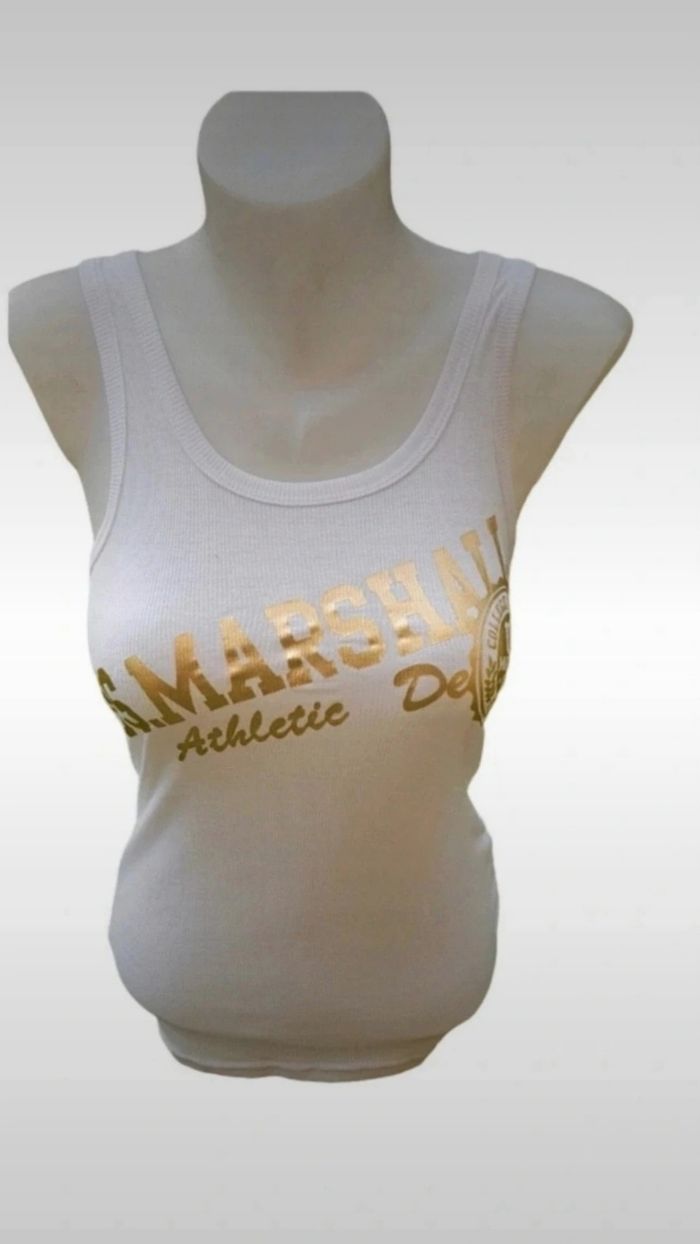Débardeur US MARSHALL femme blanc T.M Flocage de la marque sur le devant du tee shirt Produit étiqueter neuf sous blister 100% coton Prix : 10€