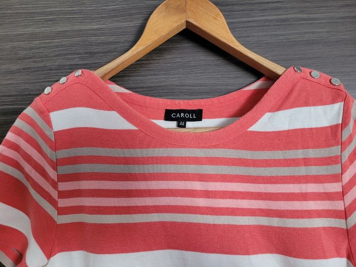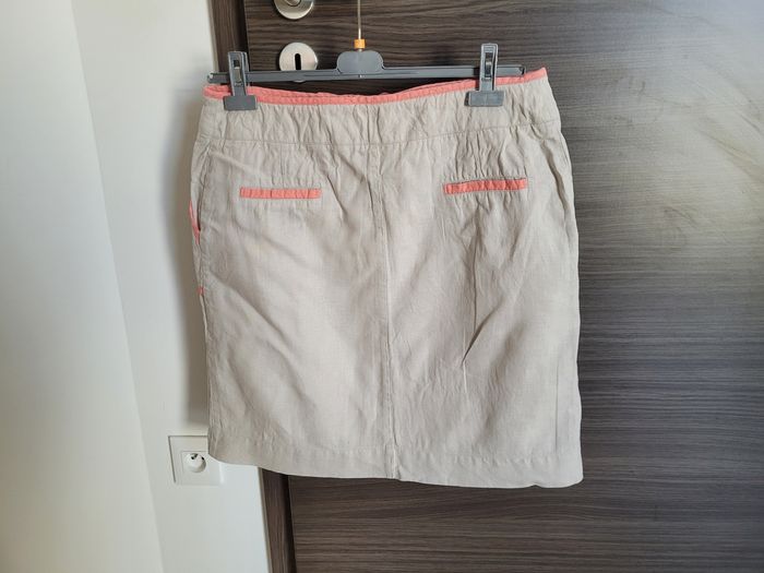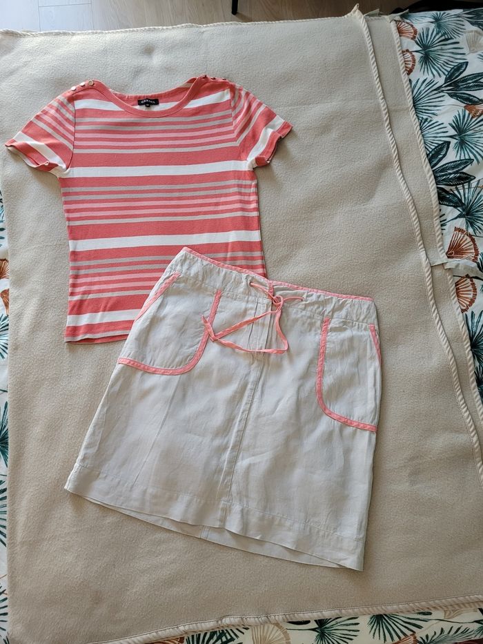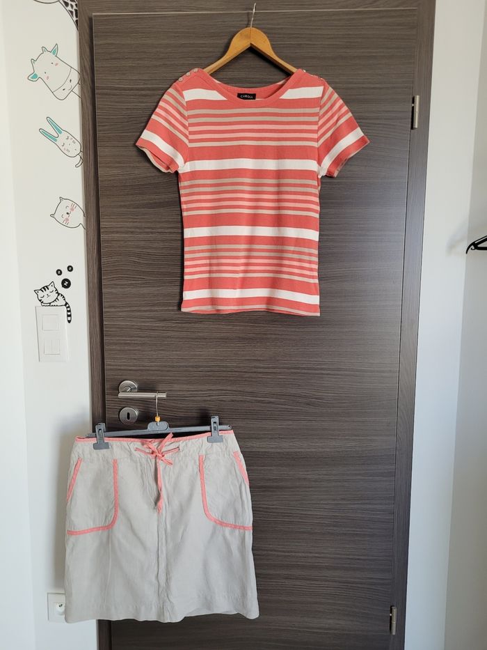 Ensemble caroll L En très bon état Top en coton et modal couleur corail Largeur aisselle 45 cm Largeur épaule 38 cm Longueur à partir de l'épaule 61 cm Jupe beige en lin, un bouton pression rajouté à la taille pour un meilleur maintien Largeur 42,5 cm à la taille Longueur 55 cm