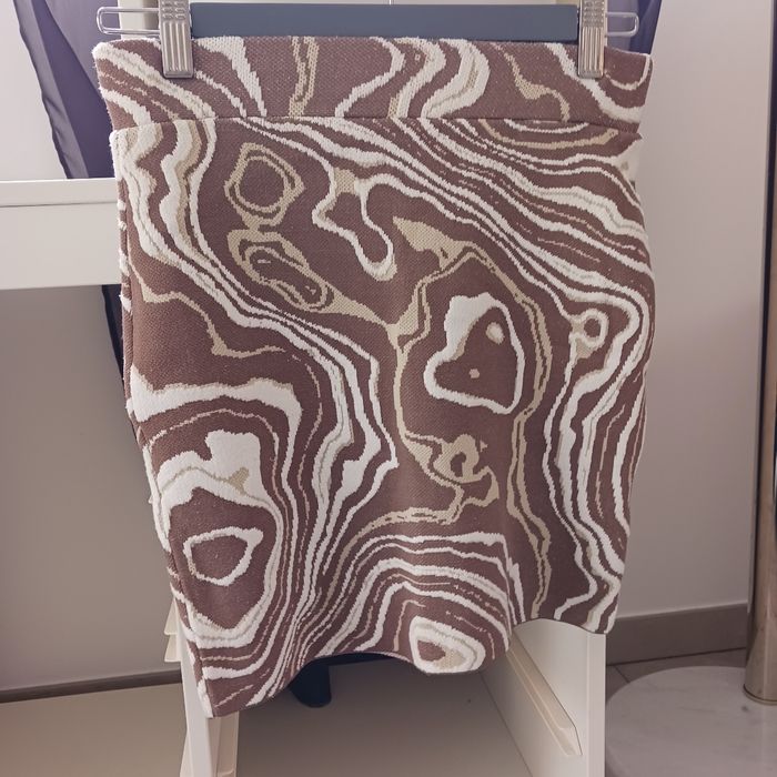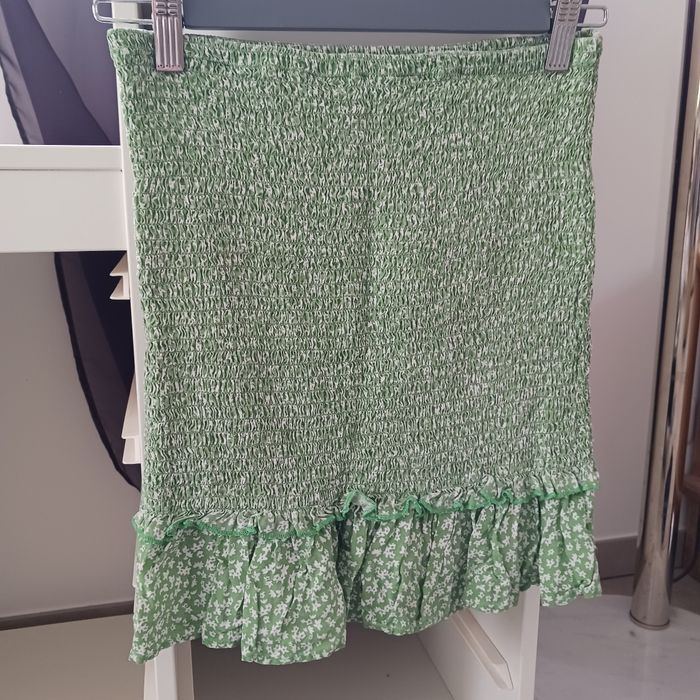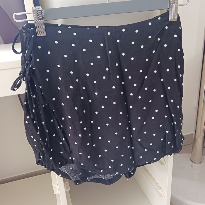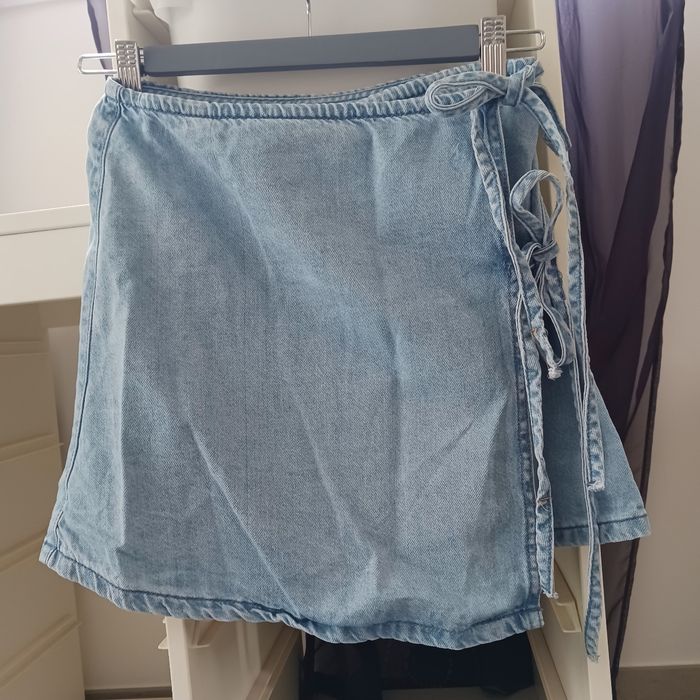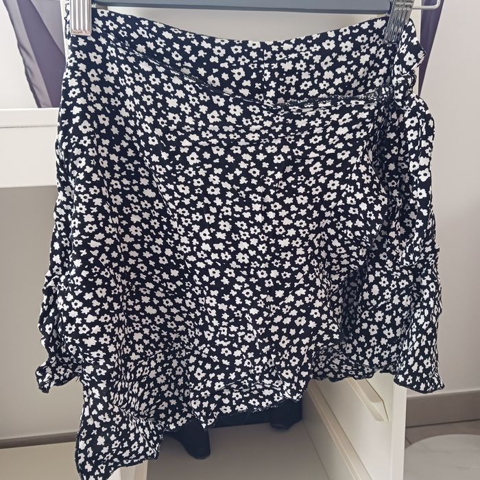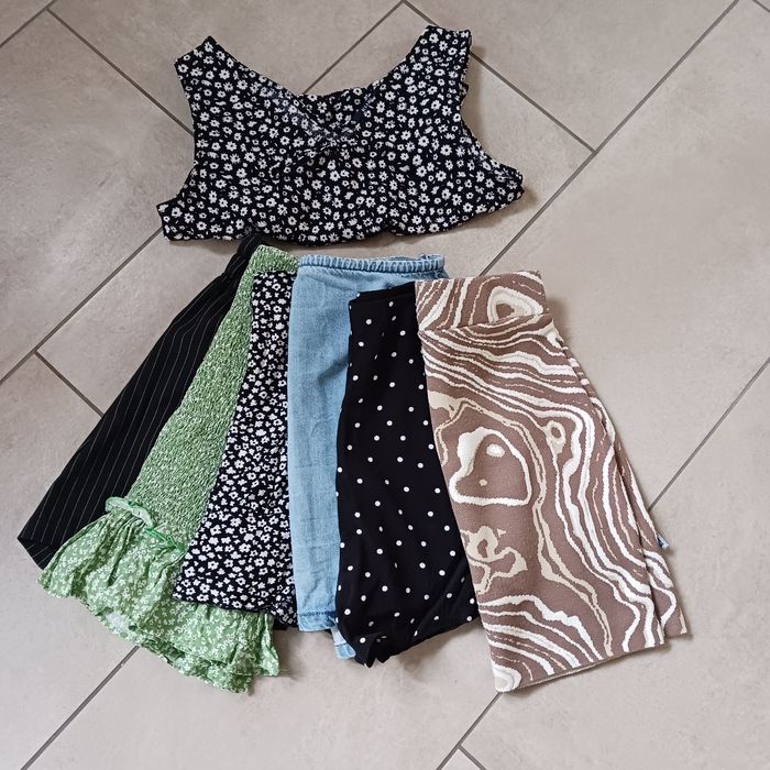Petit lot composé d'une jupe portefeuille en jean bleu clair, un short noir à rayures, une jupe à motifs marron, deux jupes short une motifs fleurs et l'autre à pois, et d"une jupe verte a fleurs Taille 34