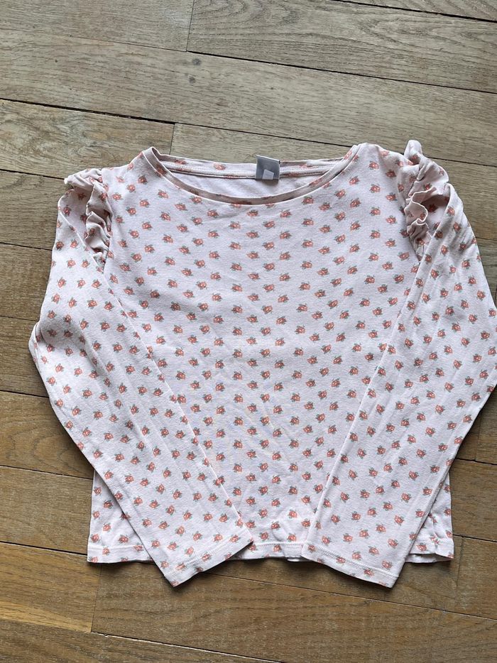 Tee-shirt manches longues rose avec fleurs rouges. Porté, bon état. pas de trou, pas de tache