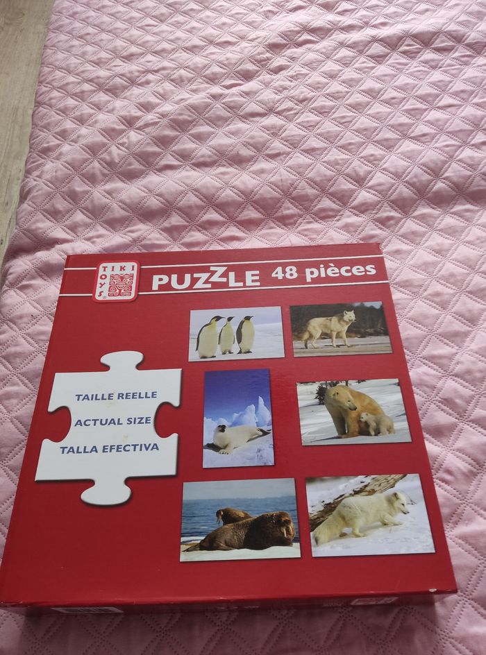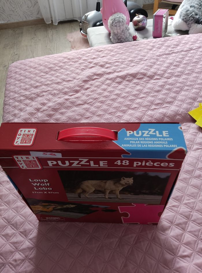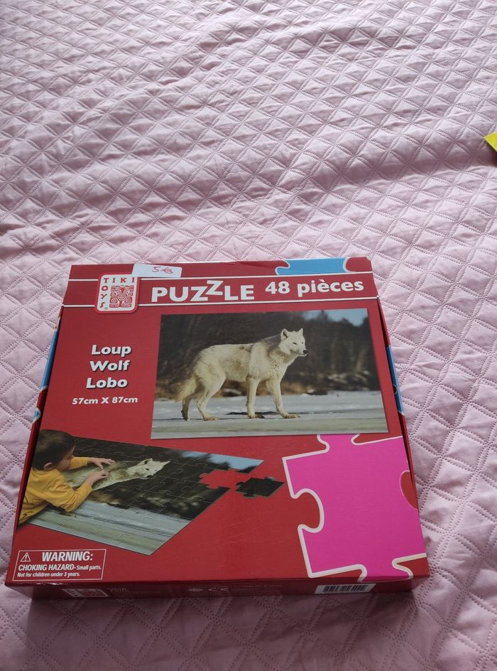 Puzzle géant de 48 pièces. Dans boîte transportable. Mesure du puzzle : 57 cm /87 cm. Marque: Tiki toys. A partir de 4ans. Le tout en excellent état.