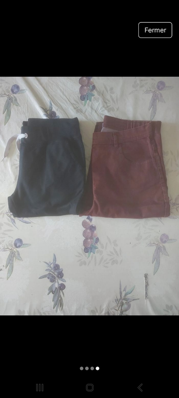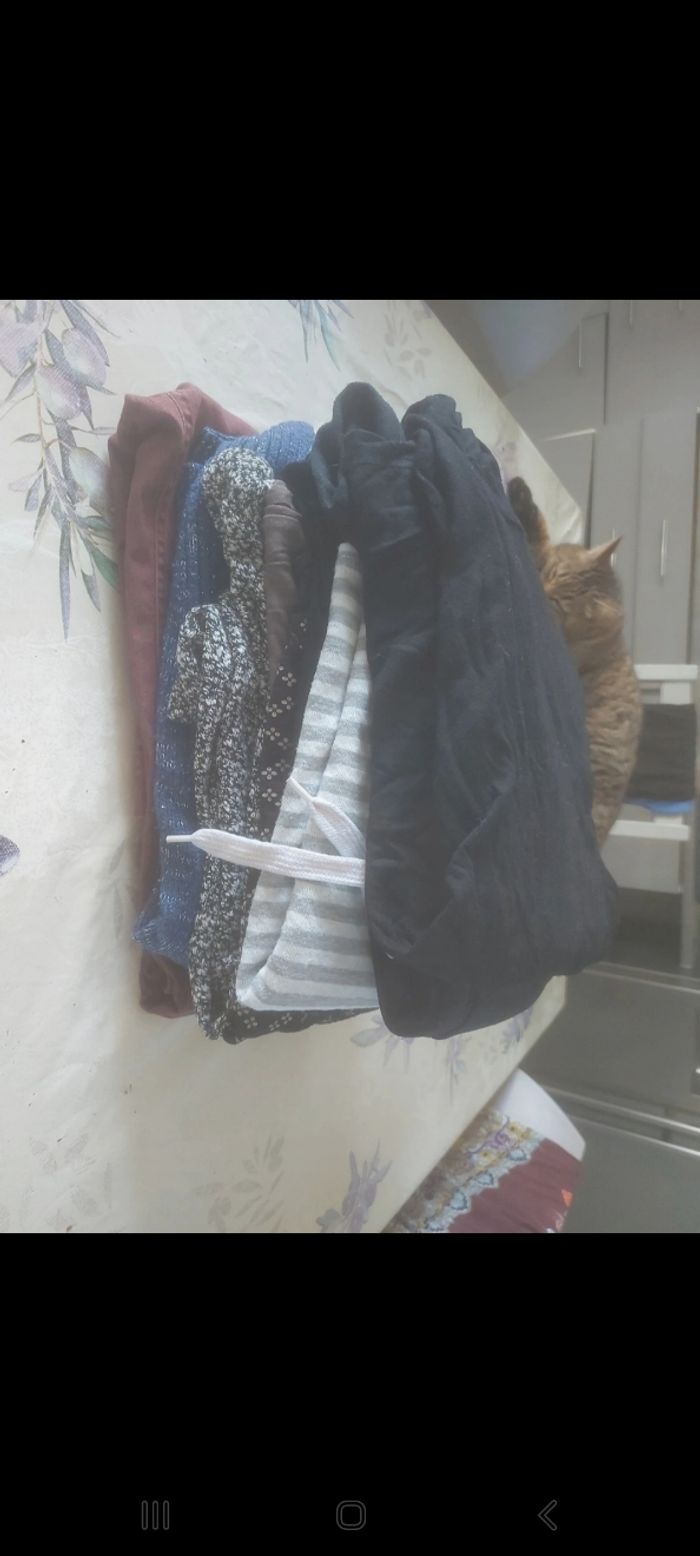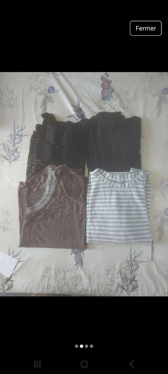 Le lot contient: 1 jeans bordeau 1 jogging noir ( quelque bouloche a certain endroit) 1 pull léger gris col roulé 1 pull bleu 1 débardeur marron kaki( manque quelque strass) 1 haut manche longue motif fleur 1 haut rayé blanc et gris 1 t-shirt col roulé noir Tous en bon état Marque différents, vous achetez se que vous voyez